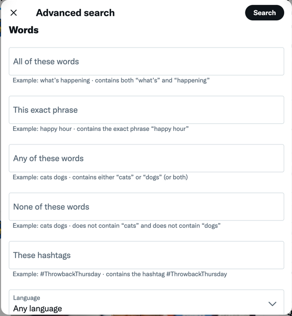 By using filters, you can learn if image-based posts attract more engagement or if text-based posts help to increase your follower count. To apply filters to your search, simply click on the options icon next to the search bar, then select “Advanced Search”.