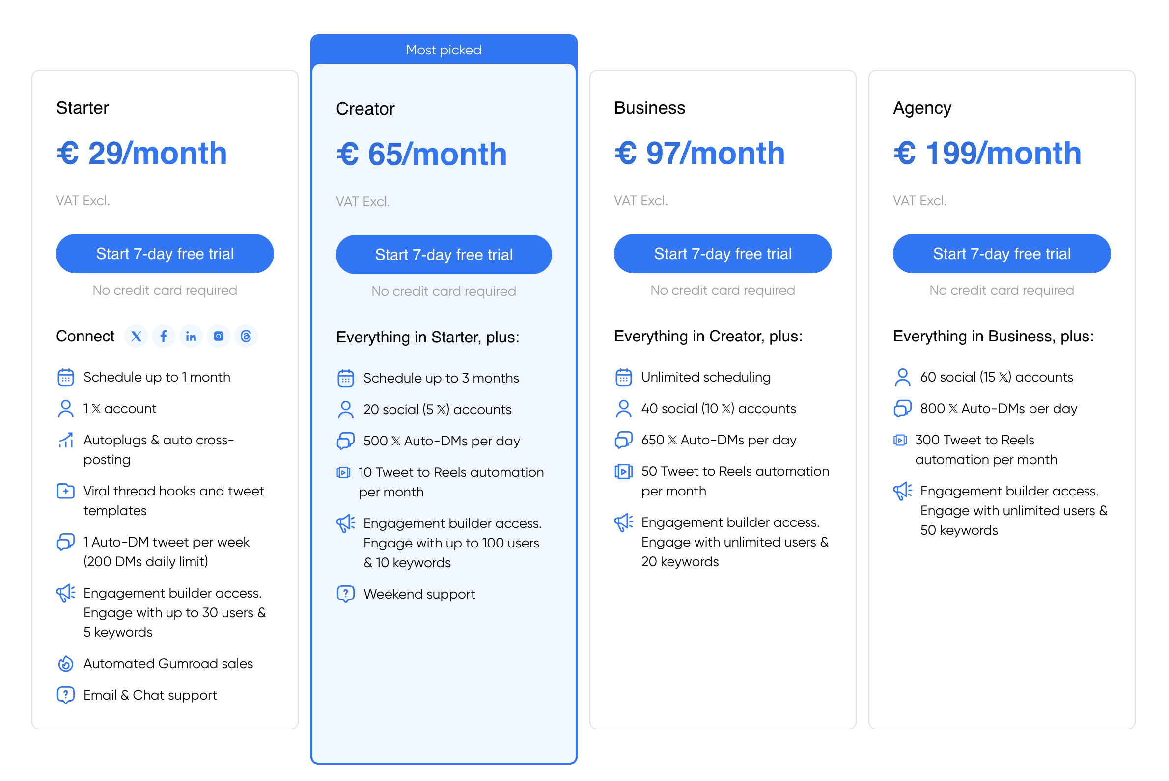 Hypefury is quite expensive. With a tiered pricing structure, the cheapest option is $29/month — and prices can go up to $199/month.