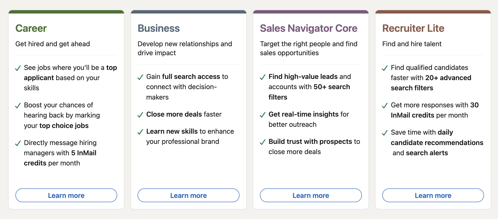 While LinkedIn Premium Career is designed for job seekers, offering insights into job applications and recruiter activity, Premium Business is more geared toward professionals looking to grow their network and generate business leads, with features like more InMail credits and enhanced profile visibility.
