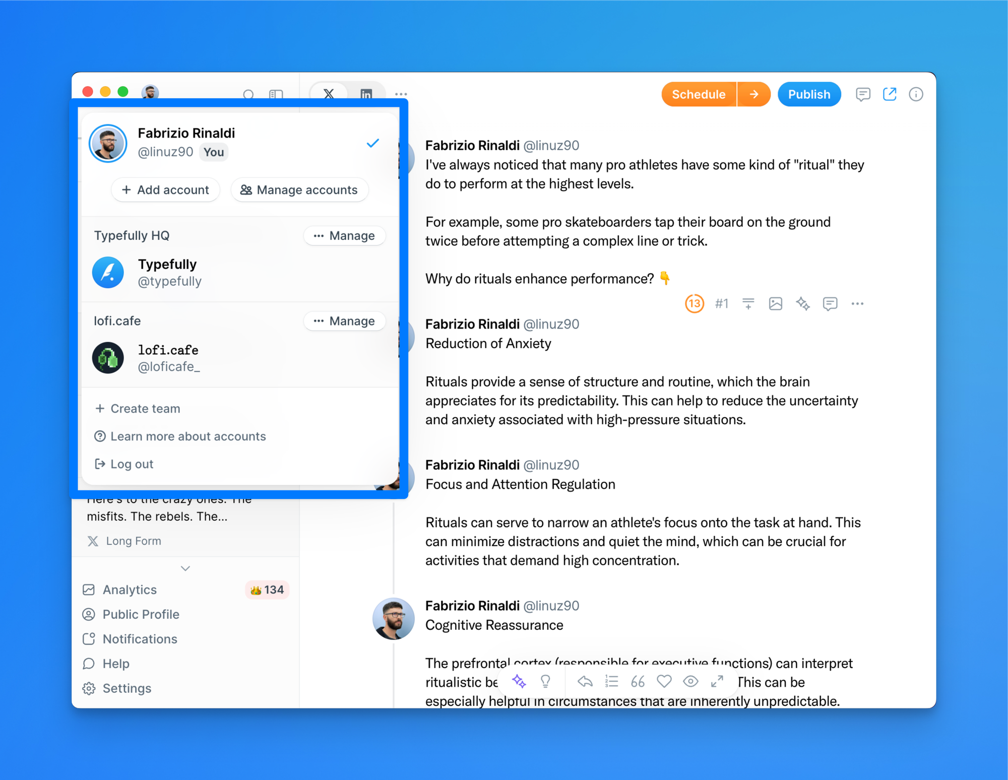 Using X/Twitter's native scheduler doesn't let you schedule tweets for multiple accounts without having to switch accounts, confirm you want to switch and then create and schedule the tweets individually With Typefully, you manage multiple accounts and switch between them with a simple click.