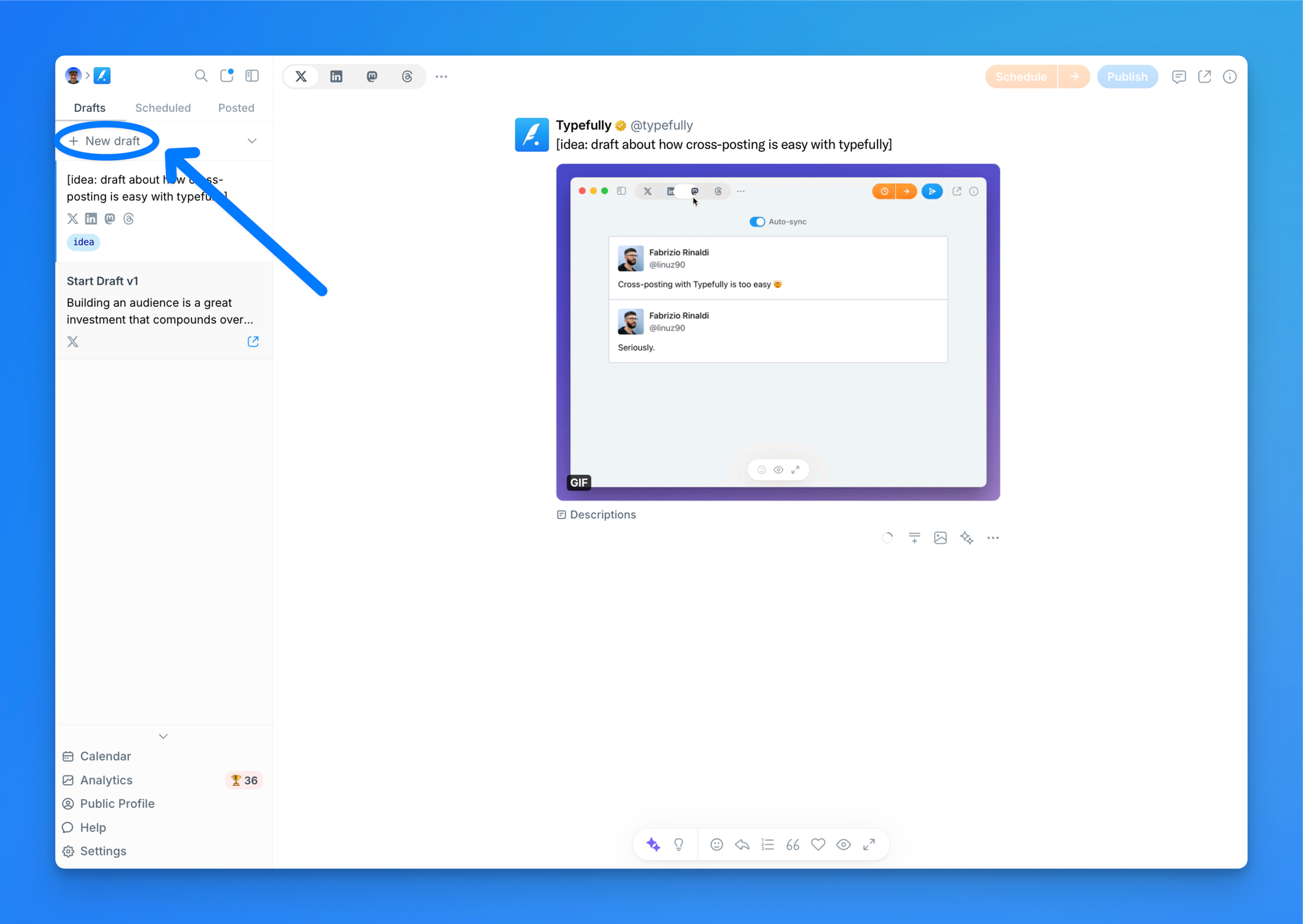 3) On your Typefully dashboard, click on "+ New draft".