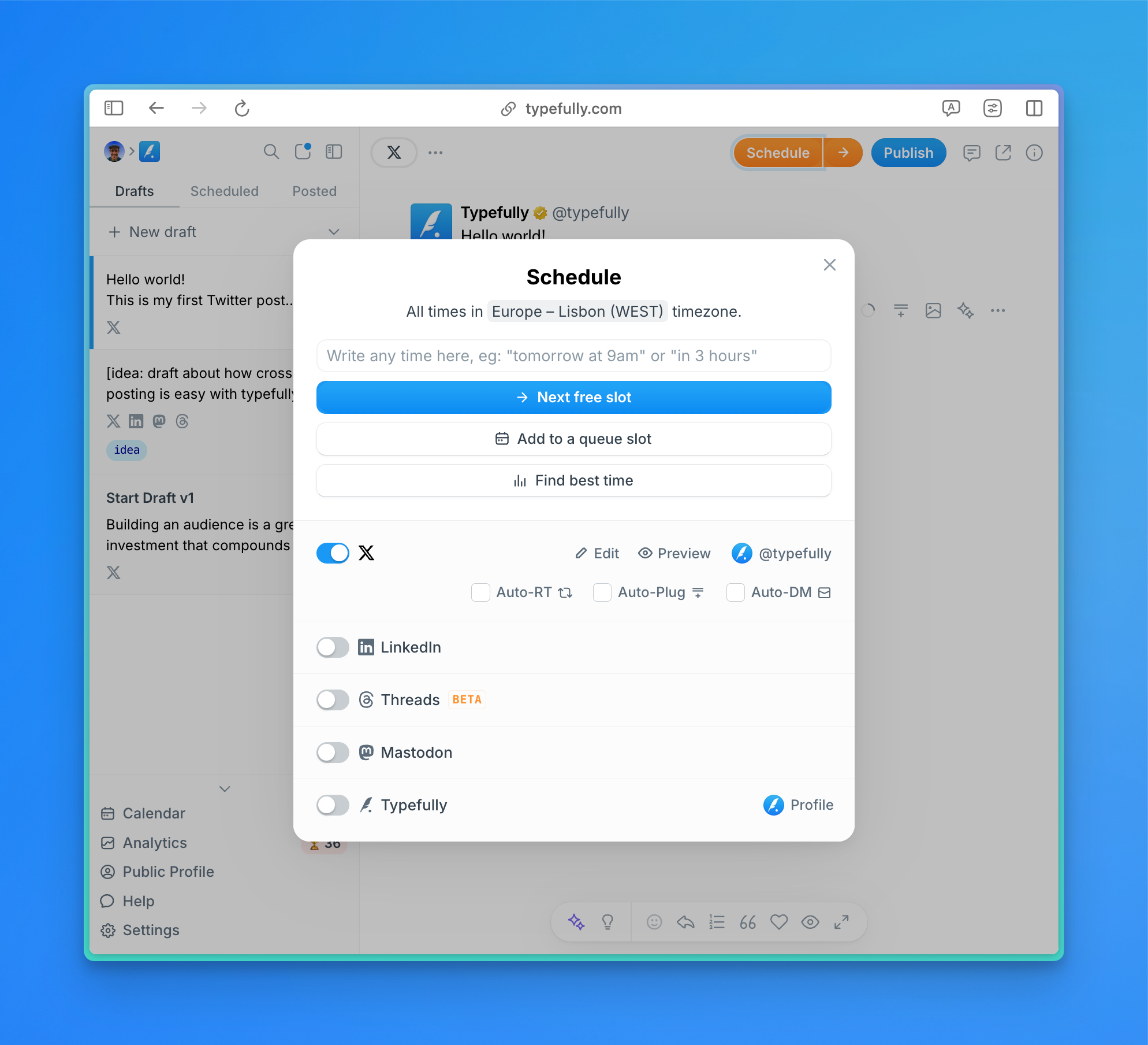 If you're keen on giving Typefully a try, the Creator plan comes with unlimited post scheduling. You can sign-up for a 14 days free trial here and test everything!