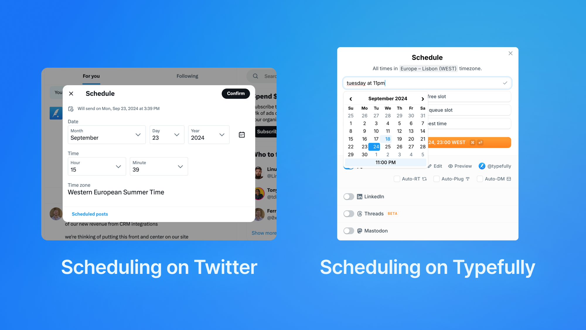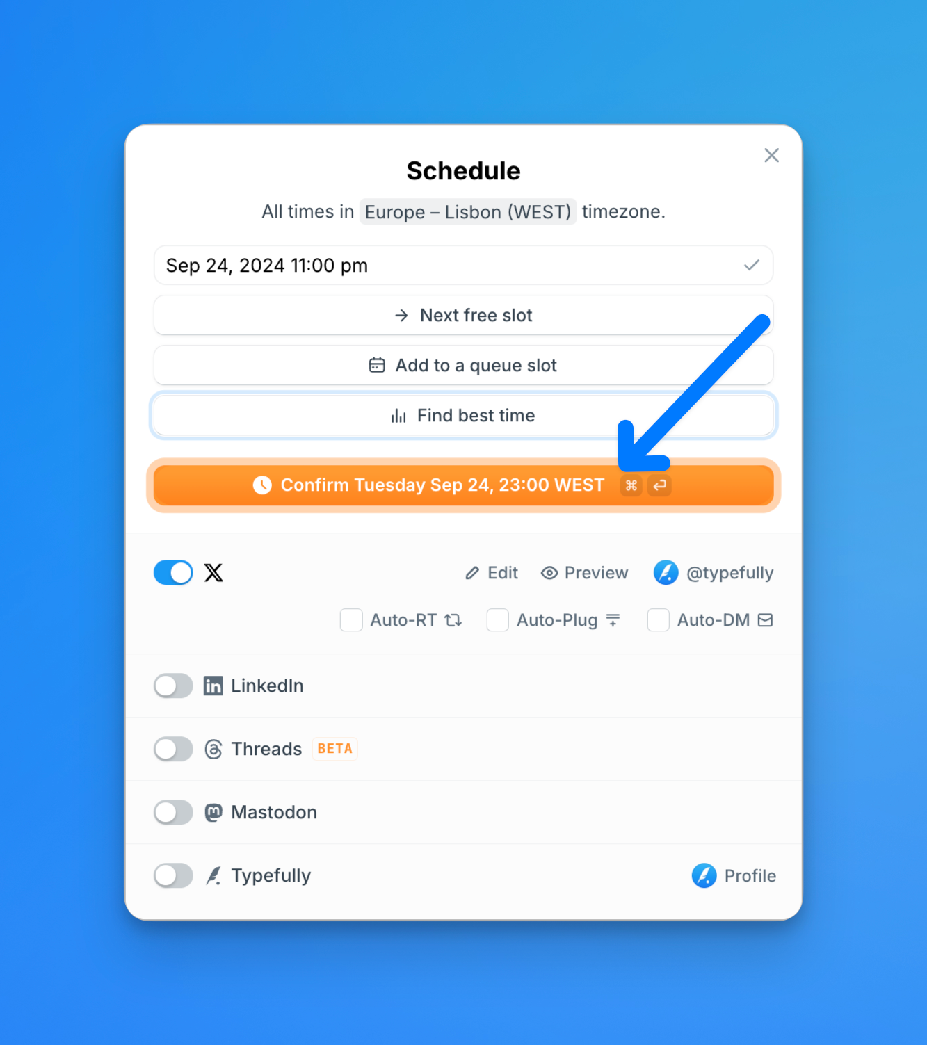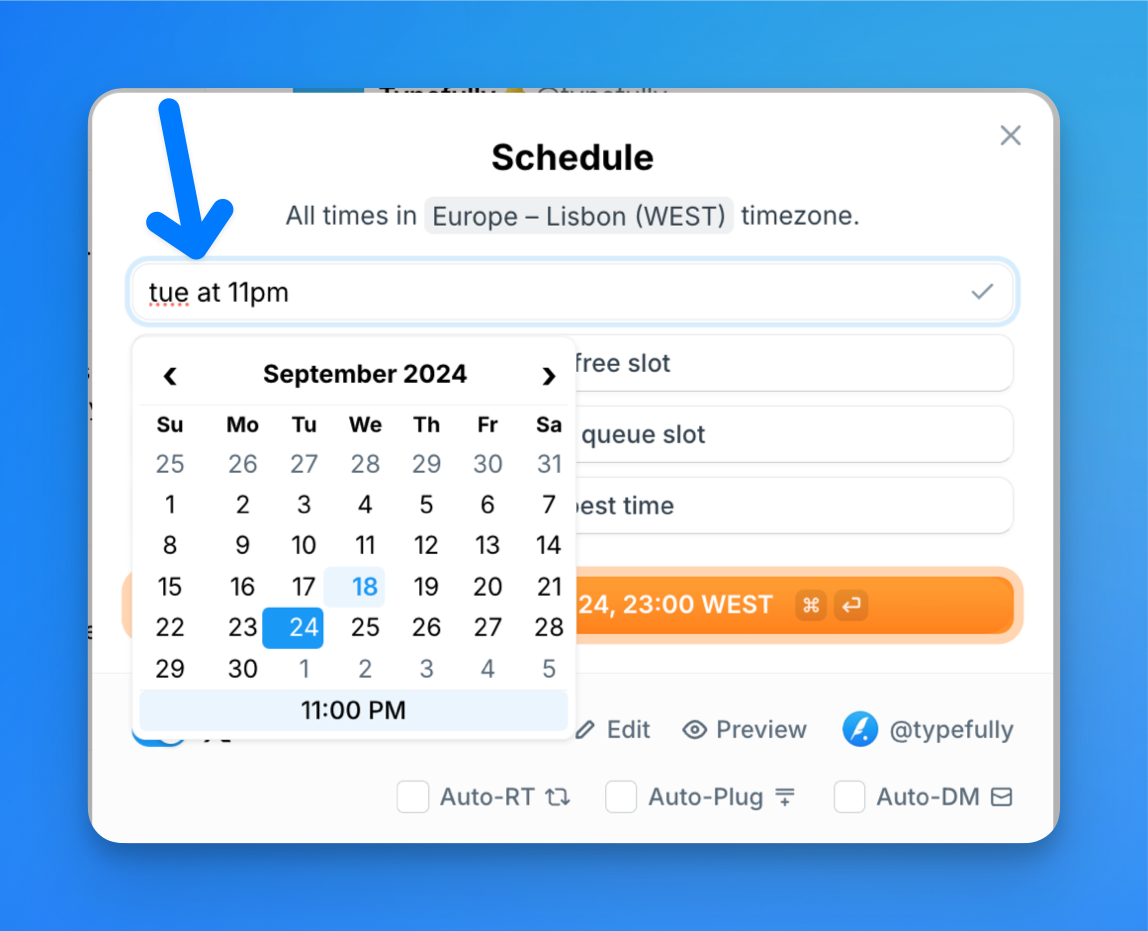 Trying to schedule a tweet on X/Twitter directly can be a cumbersome experience for some people since you need to be familiar with the platform's interface. When using Typefully, all you have to do is click on the big orange "Schedule" button, type in your date and time and you're done!