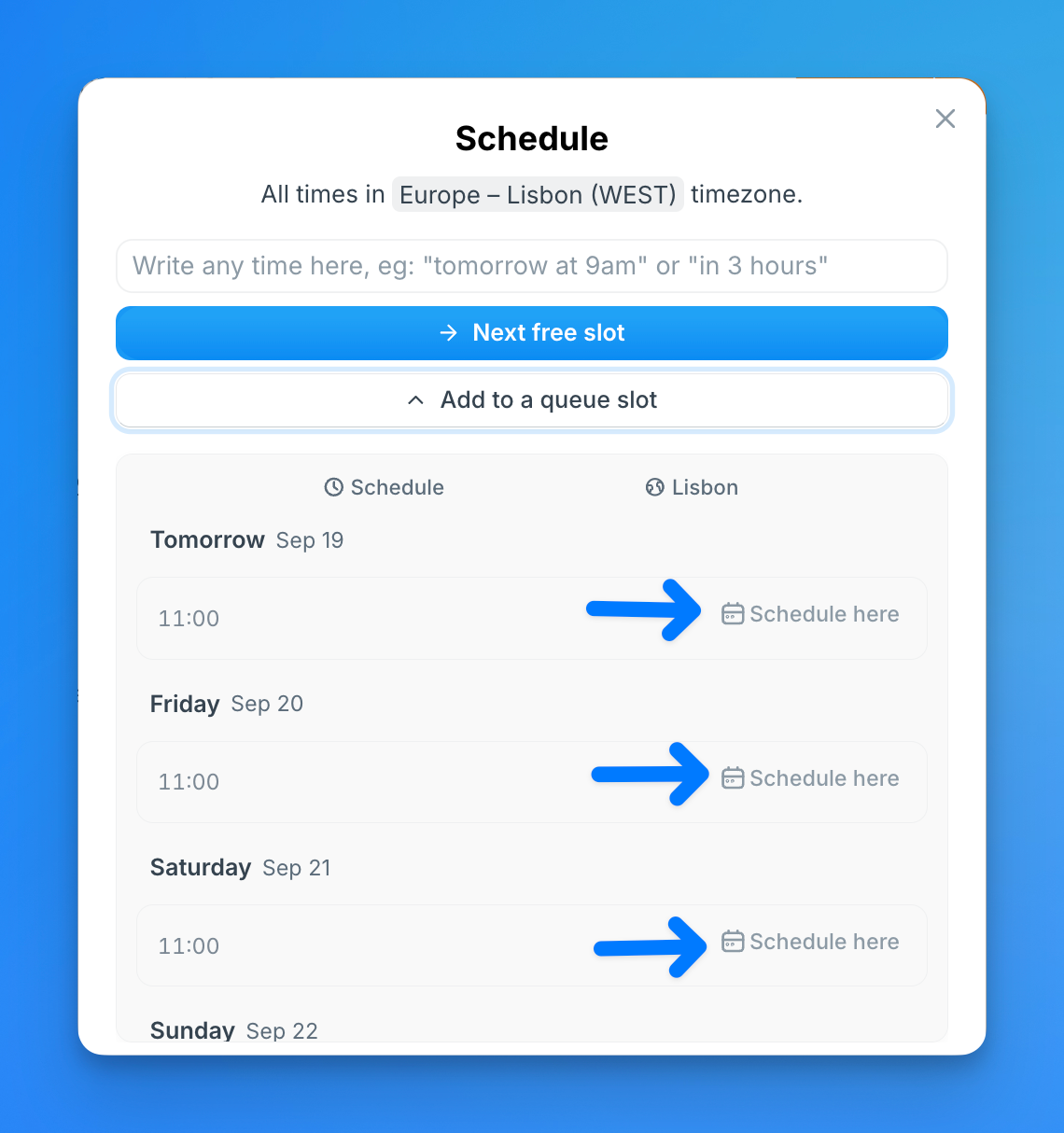 b) Select "Next free slot" or "Add to a queue slot" if you have preferred time slots you like to post at.