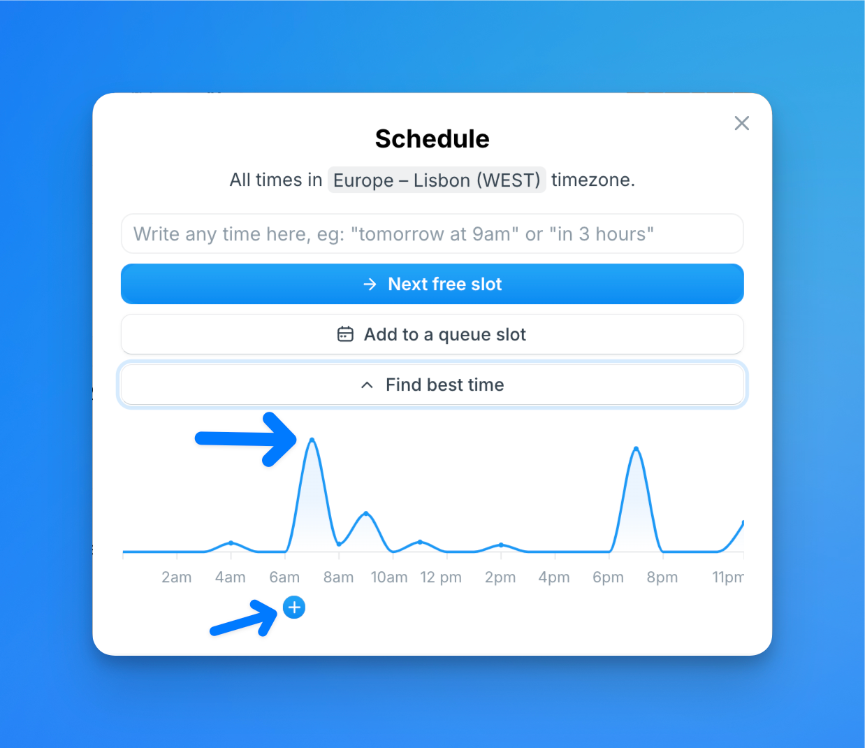 X/Twitter's native scheduler doesn't give you any indication on what are the best times based on your past posts. With Typefully, you can at which times your posts get the most engagement and choose them when scheduling your tweets.