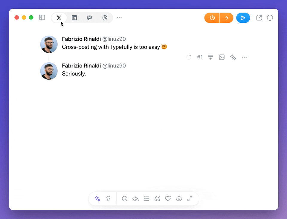 Write once, publish everywhere. Typefully lets you post the same content (or customize it) across X, LinkedIn, Threads, and Bluesky with a single click.
