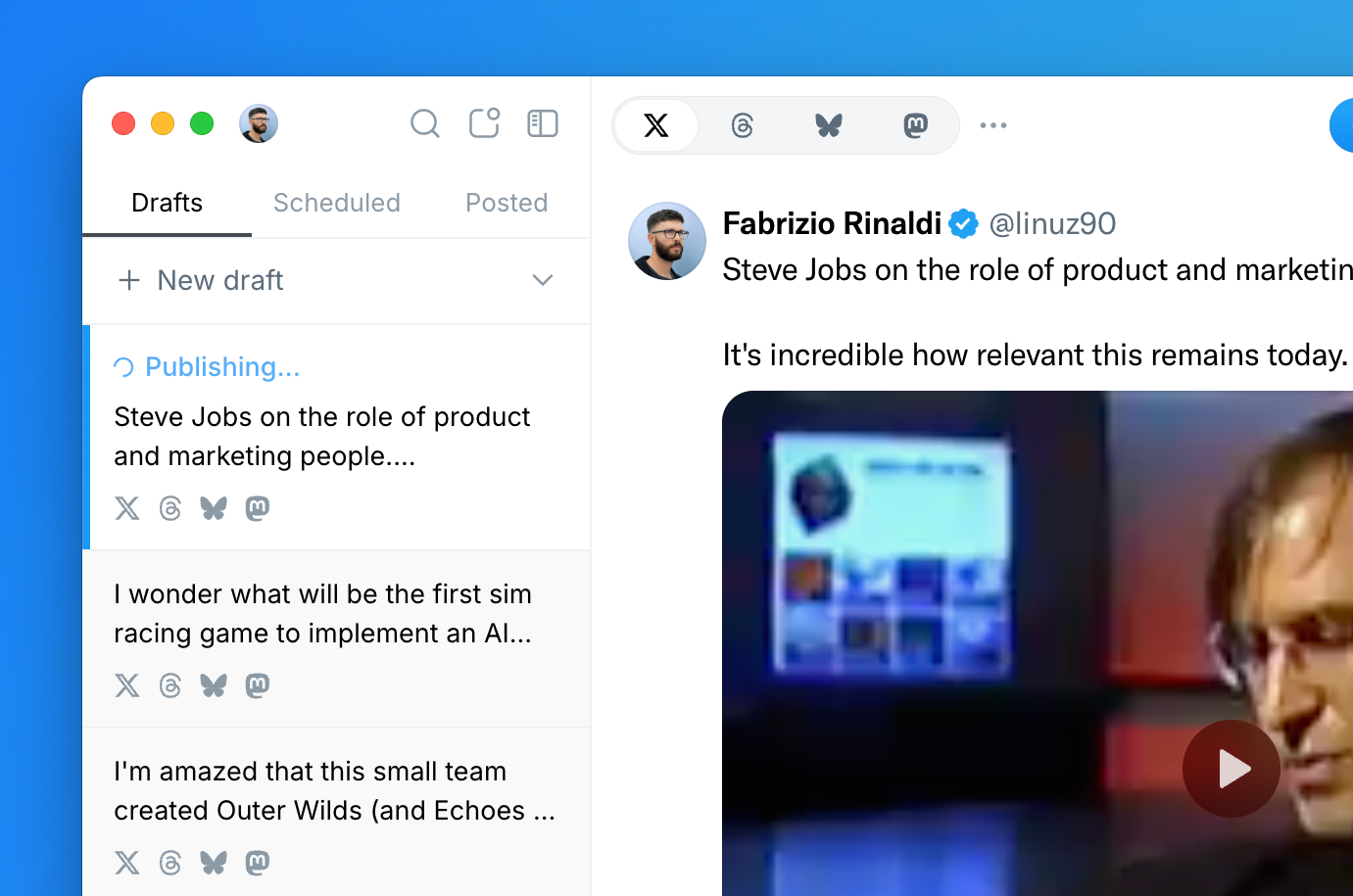 If you want to post the same content on LinkedIn, Threads, or Bluesky, you'll have to rewrite and reschedule it manually on each platform.