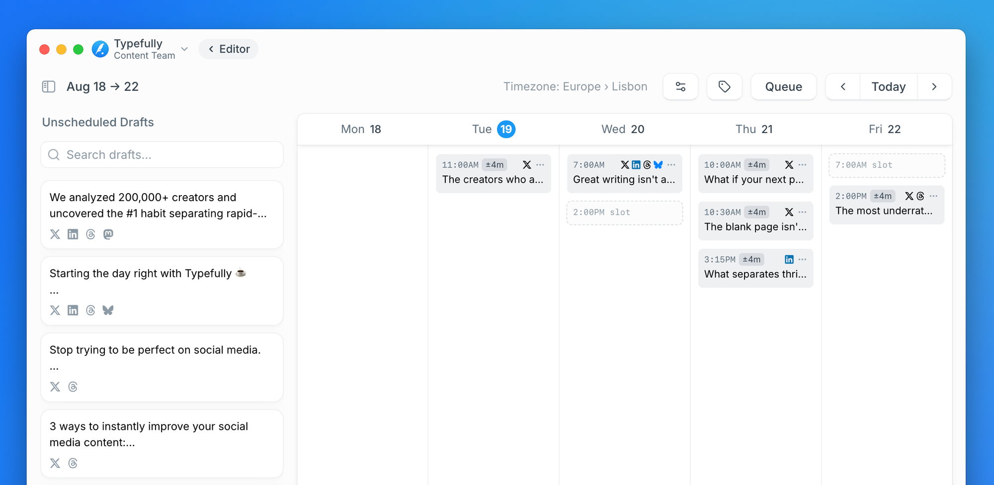 Typefully is a clean, distraction-free writing and scheduling tool for X, LinkedIn, Threads, Bluesky, and Mastodon. It's built specifically for creators and marketers who want to grow their audience without the stress of losing content.