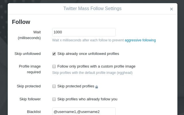 You can also alter certain settings, such as the wait time in between each follow, skipping profiles you’ve already followed and unfollowed, blacklisting specific users, and requiring users to have a profile bio, among other things. These settings help you target the right users while avoiding getting your account locked.