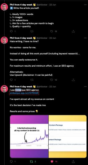 For instance, @philostar, founder of 4 day week, publishes a thread on how he grows his job platform through SEO, shows the relevant stats, and plugs in the affiliate link of the SEO marketing agency that’s helped him succeed. Hook, line and sinker.
