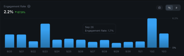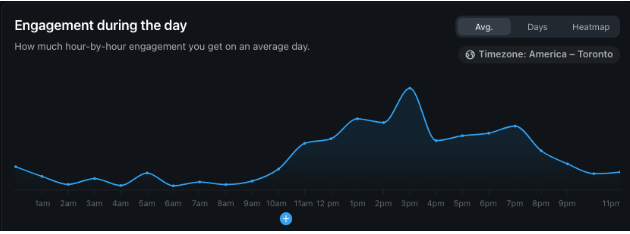 For example, if your goal is to get more clicks and traffic to your website, then you'll want to track when you get the most engagement. Typefully shows you this data with easy-to-read graphical displays on when users interact most with your tweets during the day and even month.