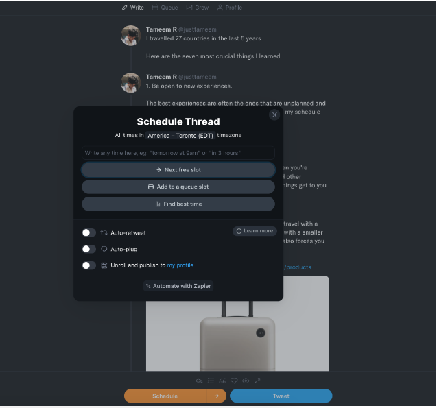 You can then schedule your tweets for publication at the optimal times straight from the Typefully editor.