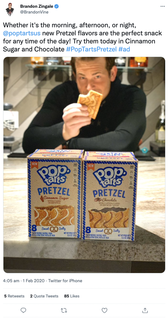 Pop Tarts wanted to promote their new line of sweet and salty flavors. To help with this campaign, the brand partnered up with top Twitter content creators @brandonvine to generate 36,000 organic impressions and over 750 brand engagements.