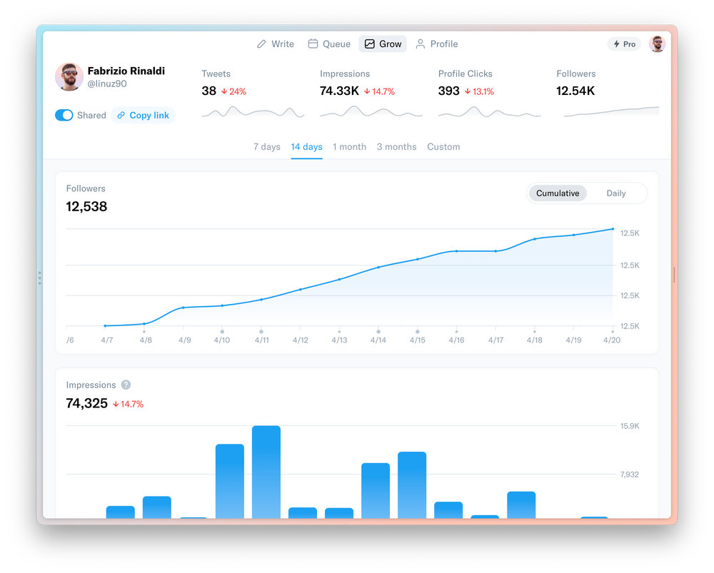 That’s where Typefully comes in. Our analytics feature provides you with all the Twitter ranking tools you need to optimize your account. You can also create posts, schedule, and tweet straight from our user-friendly dashboard.