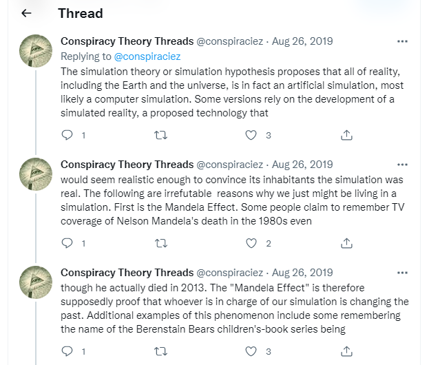 We can use tweetstorms to explain complicated topics. This is a Mandela effect Twitter thread of examples of us living in a simulation.