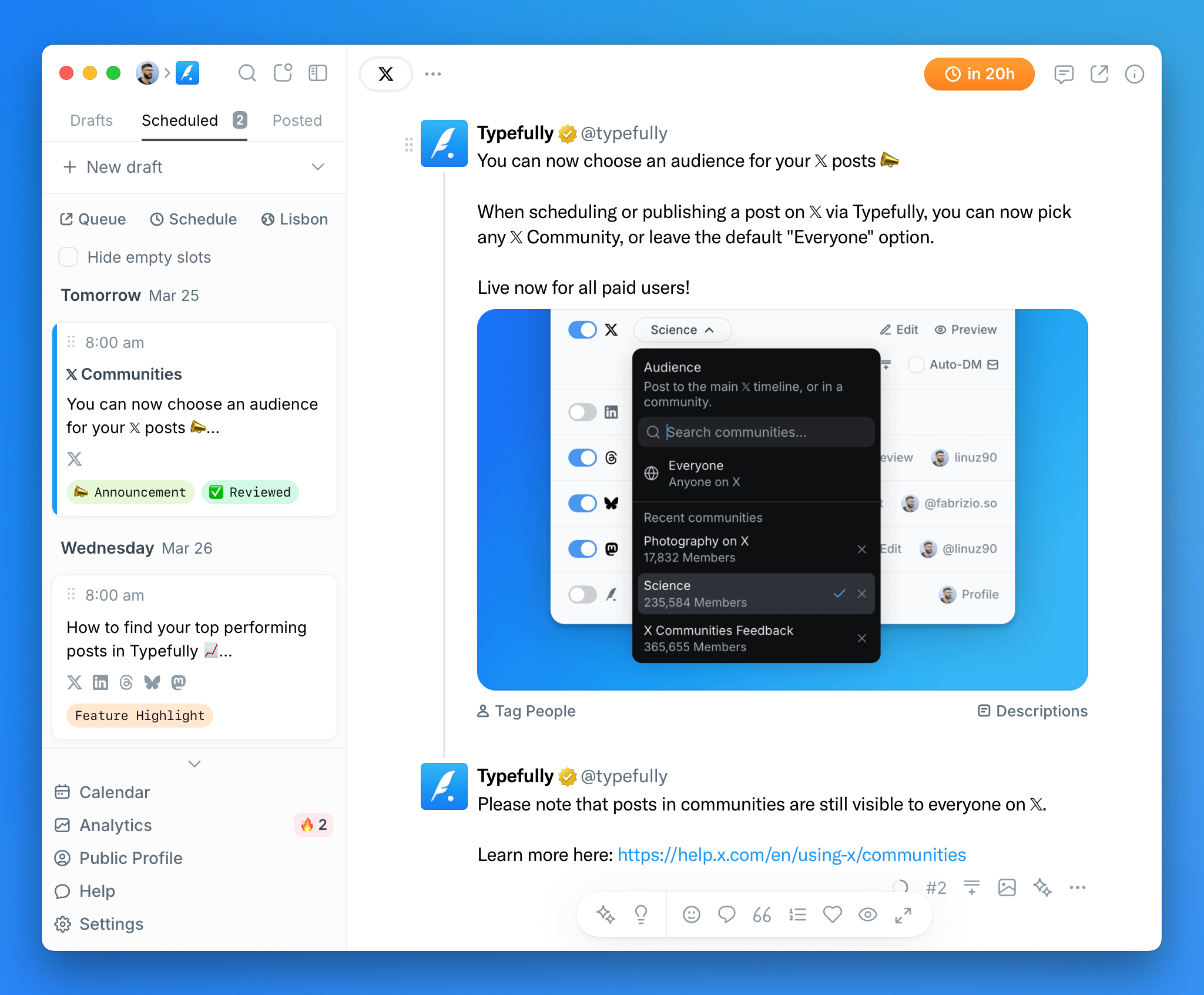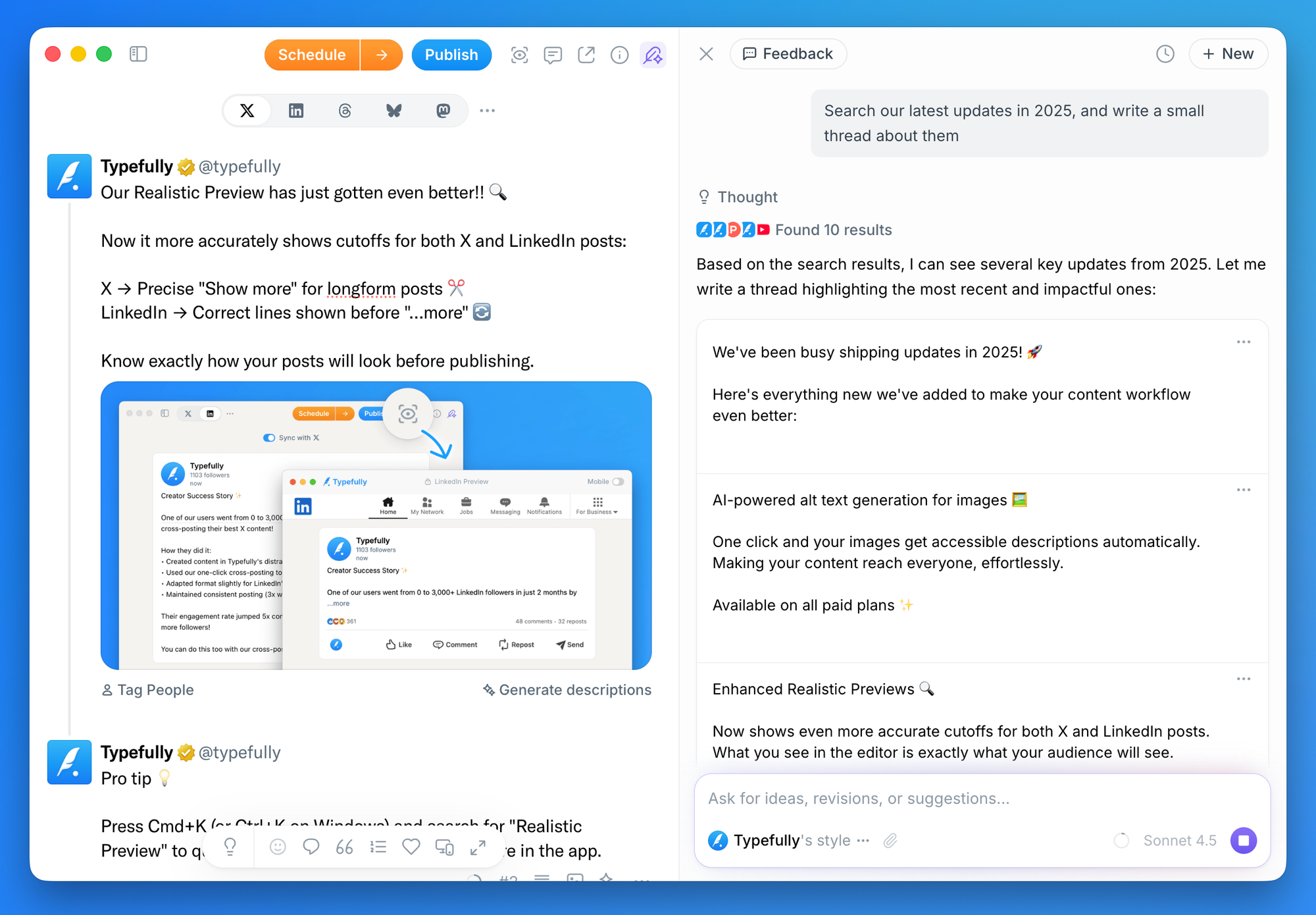 Typefully is a beautiful content creation and scheduling app for X, LinkedIn, Threads, Bluesky, and Mastodon. It's designed to be pleasant to use, help you write better content, and grow your audience authentically.