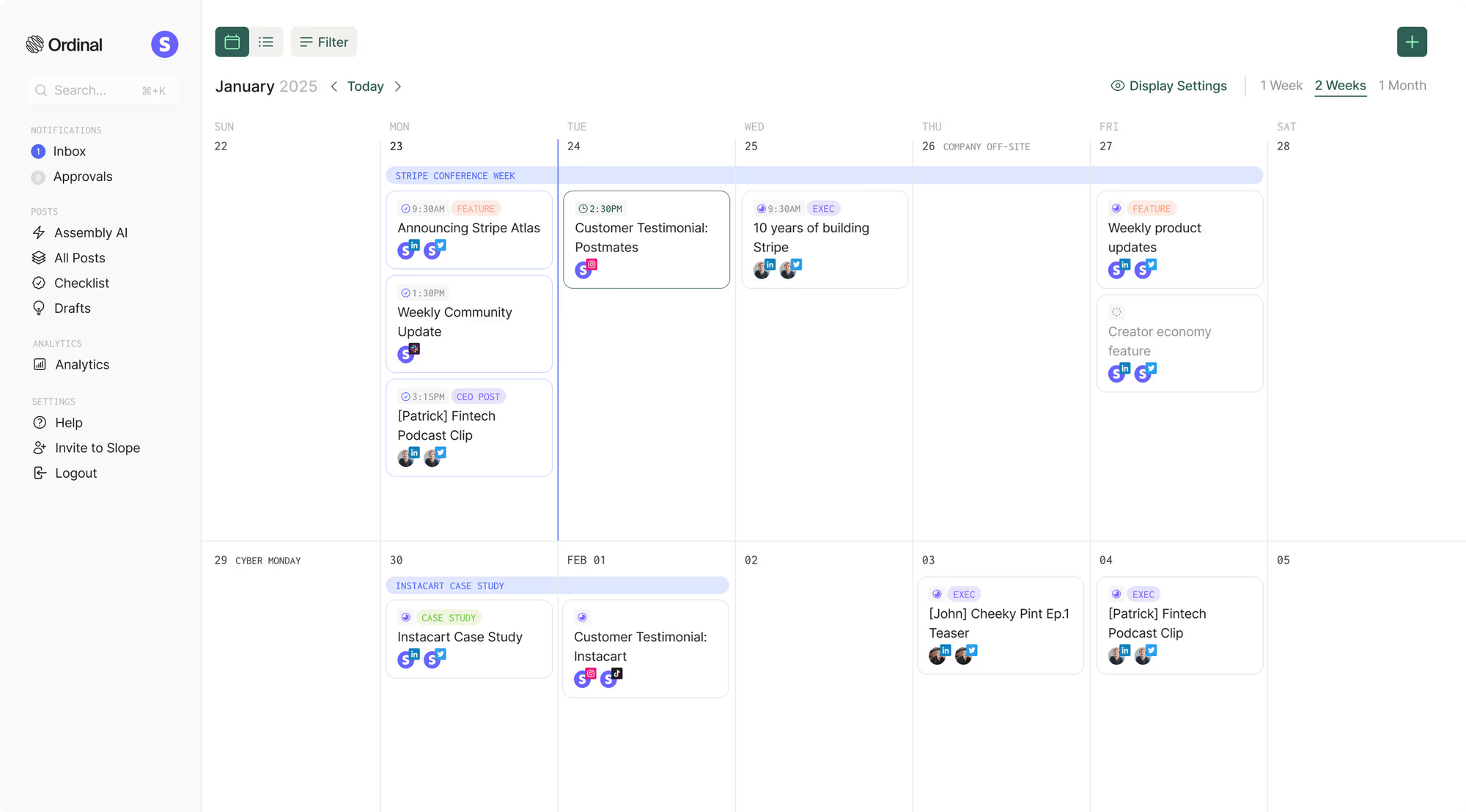 Ordinal offers a visual content calendar with campaigns, allowing teams to plan content across multiple accounts and channels.