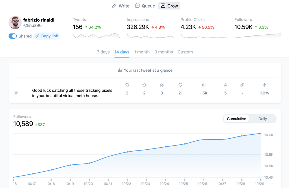Typefully provides you a platform to boost your Twitter growth with engagement analytics to optimize your marketing strategy. With this tool, you can discover insights into the best time to post a tweet for high engagement and how users engage with your tweets.
