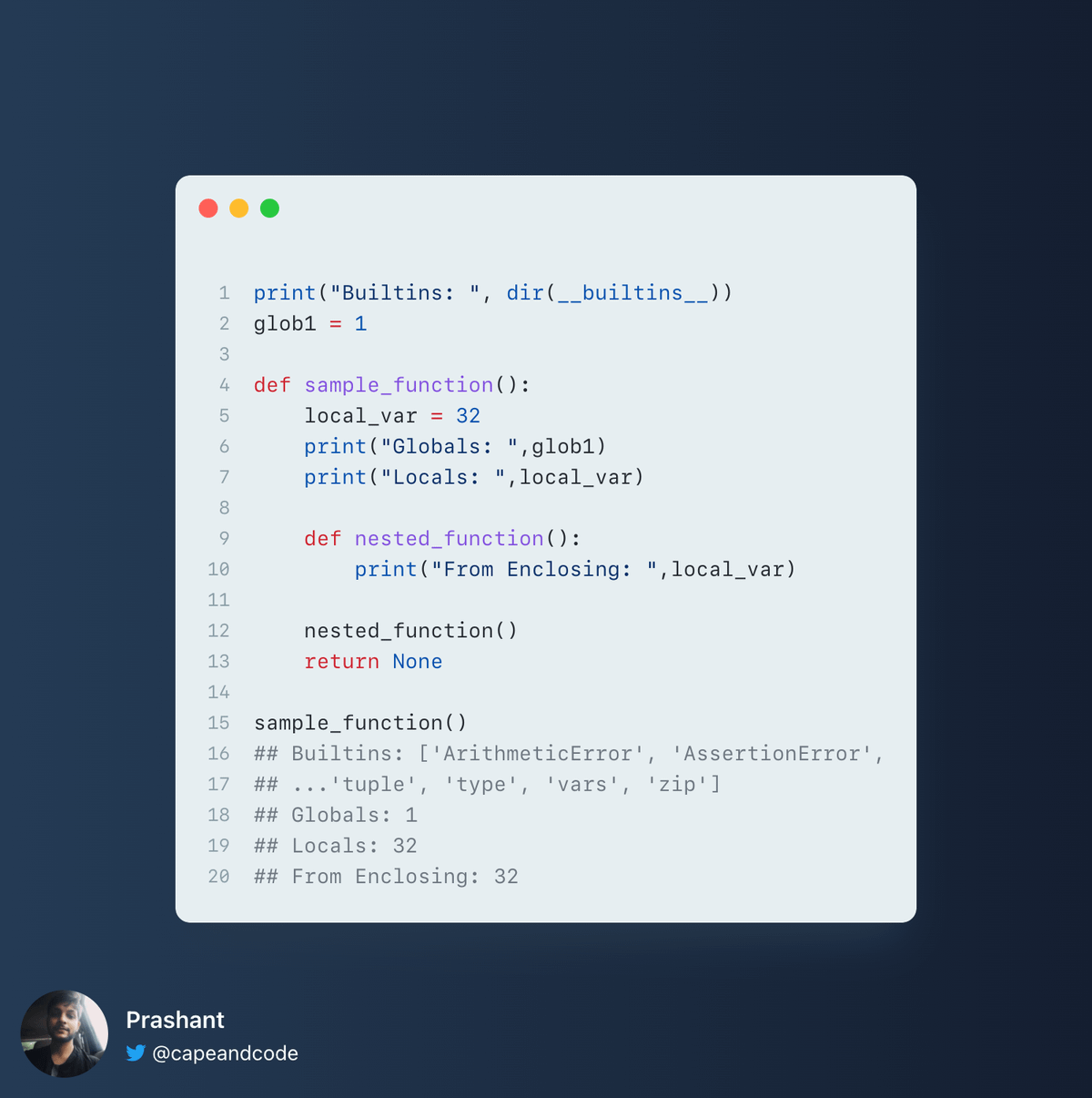 • The enclosing namespace is the outer namespace available to a function that is defined inside another function.