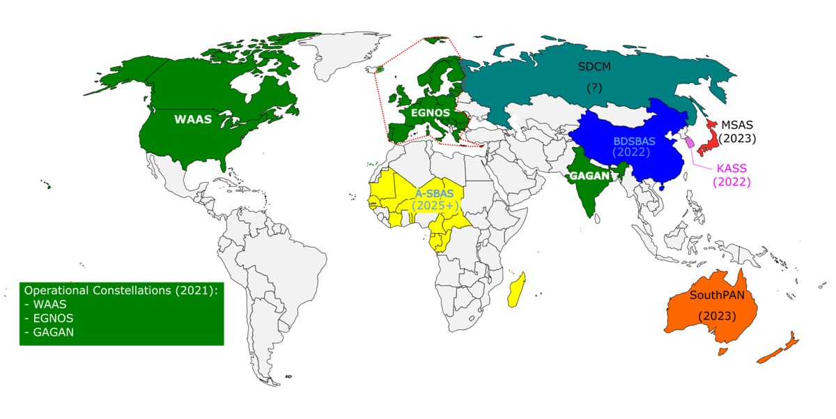 For US airspace the SBAS augmentation is provided by “Wide-Area Augmentation System” (WAAS) & in India “GPS Aided GEO Augmented Navigation” (GAGAN). Other SBAS satellites are being deployed in Japan, Australia/New Zealand and China, and being developed for South Korea and Africa