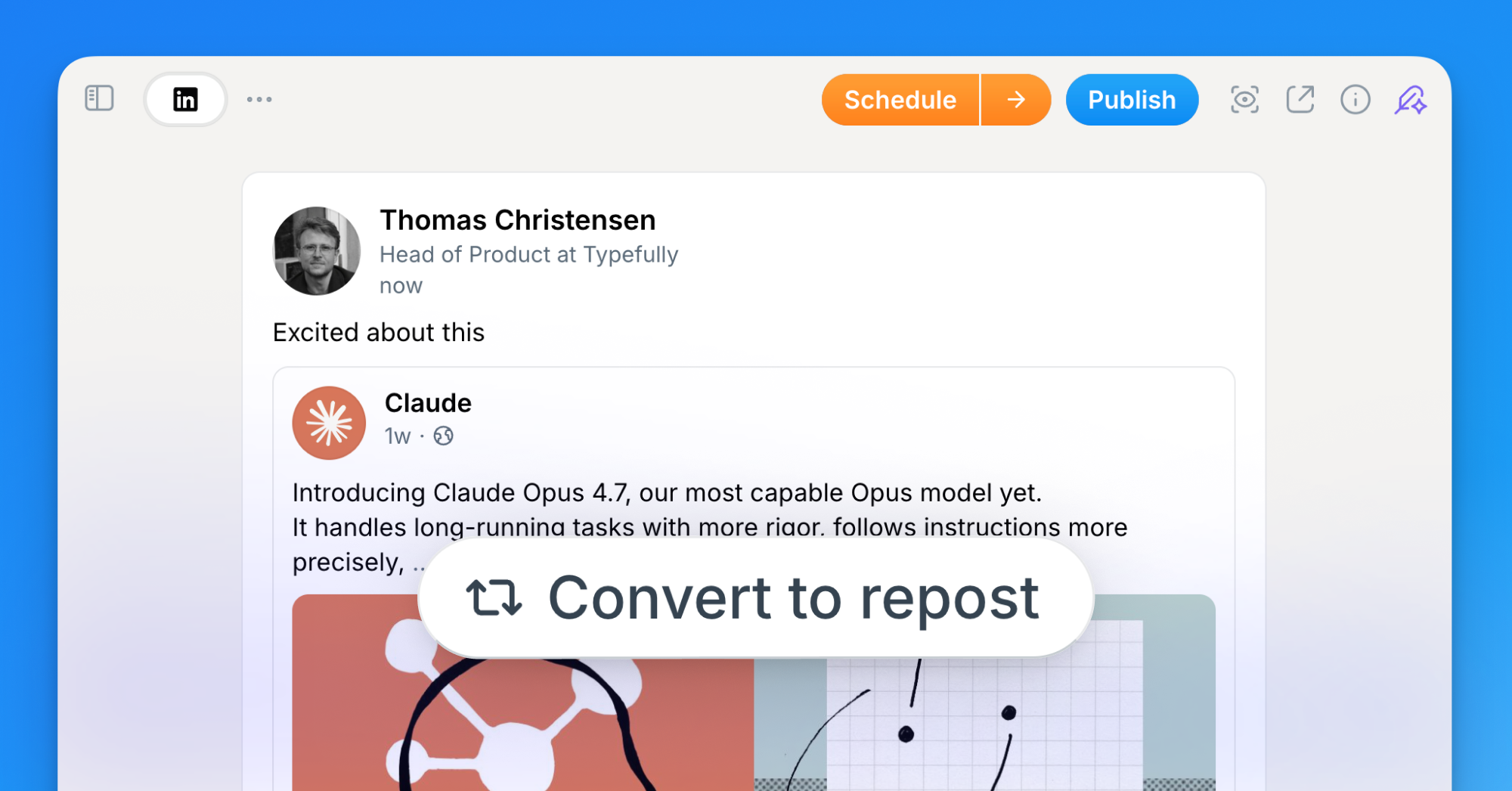 Reposts are also supported via our API, so your agents and integrations can draft them programmatically.