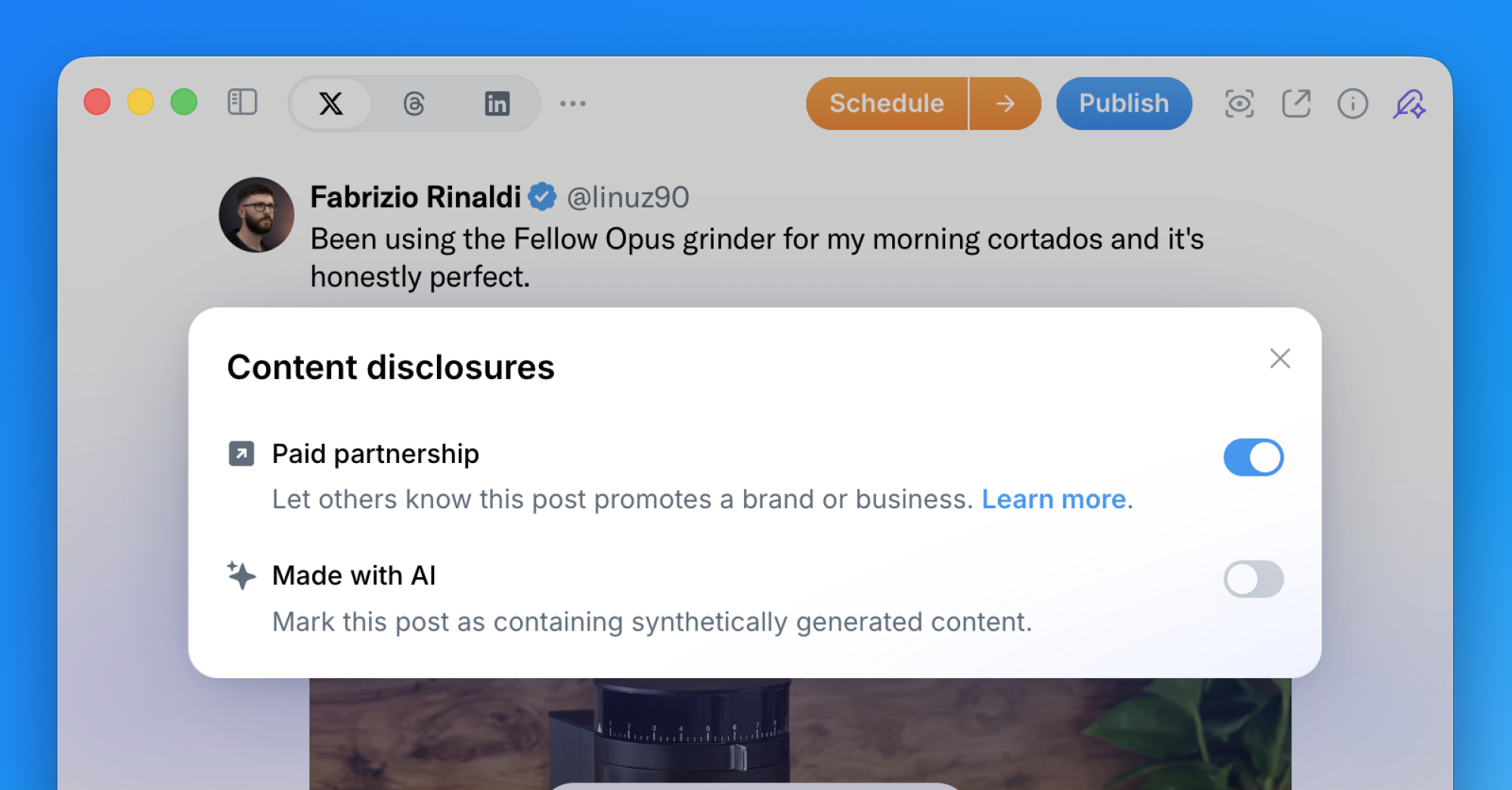 You can now add content disclosures to your X posts directly from the Typefully editor. Two disclosure types are supported: