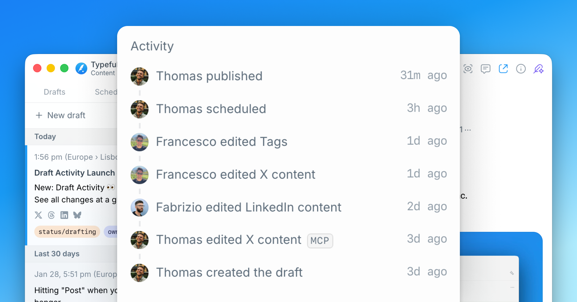 Draft Activity logs every change to your drafts automatically. For each update, you'll see who made the change, when it happened, what was modified (content, tags, platforms, scheduling, publishing), and where the change came from. For example, if an AI agent created the draft, it’s labelled MCP or API.
