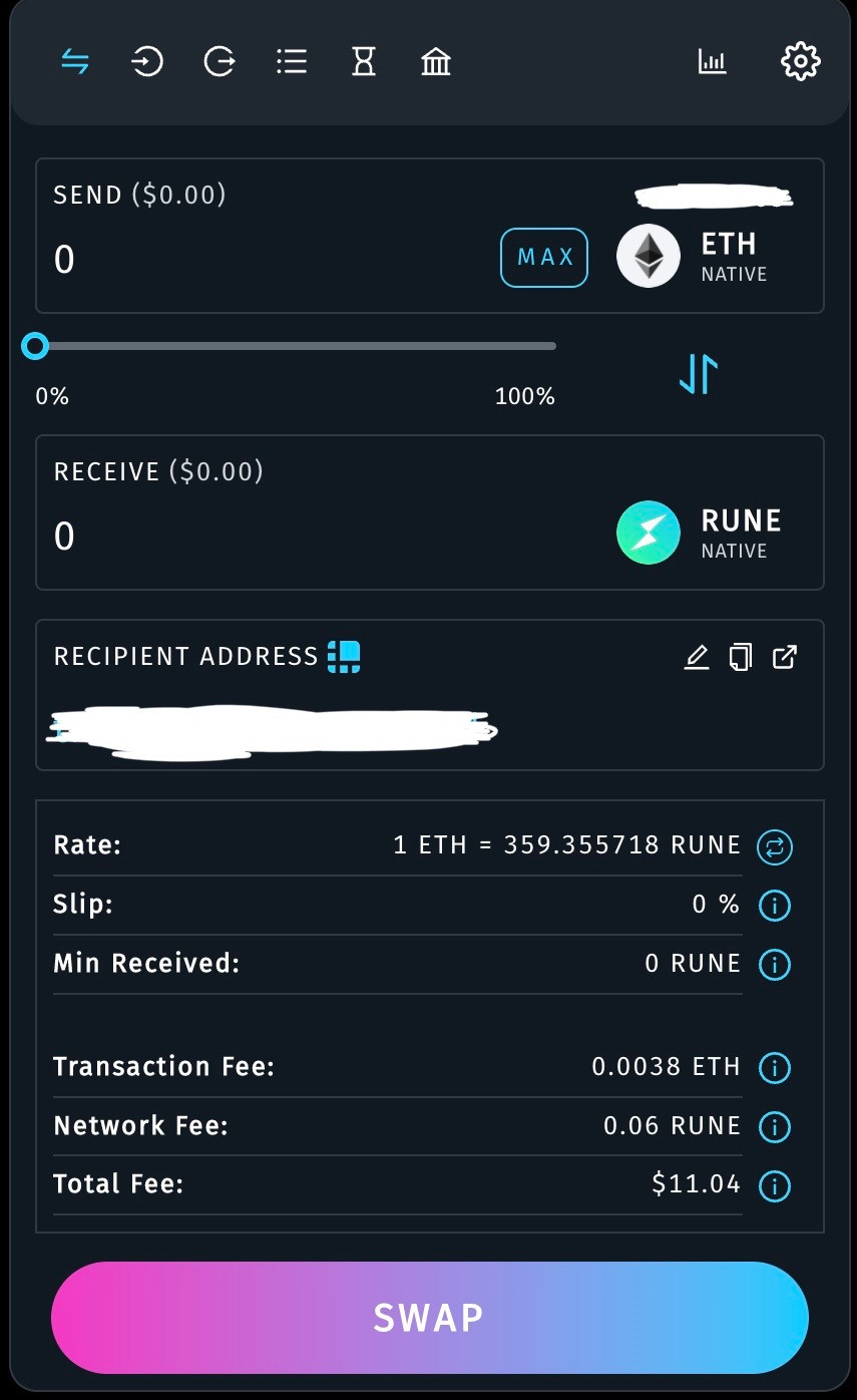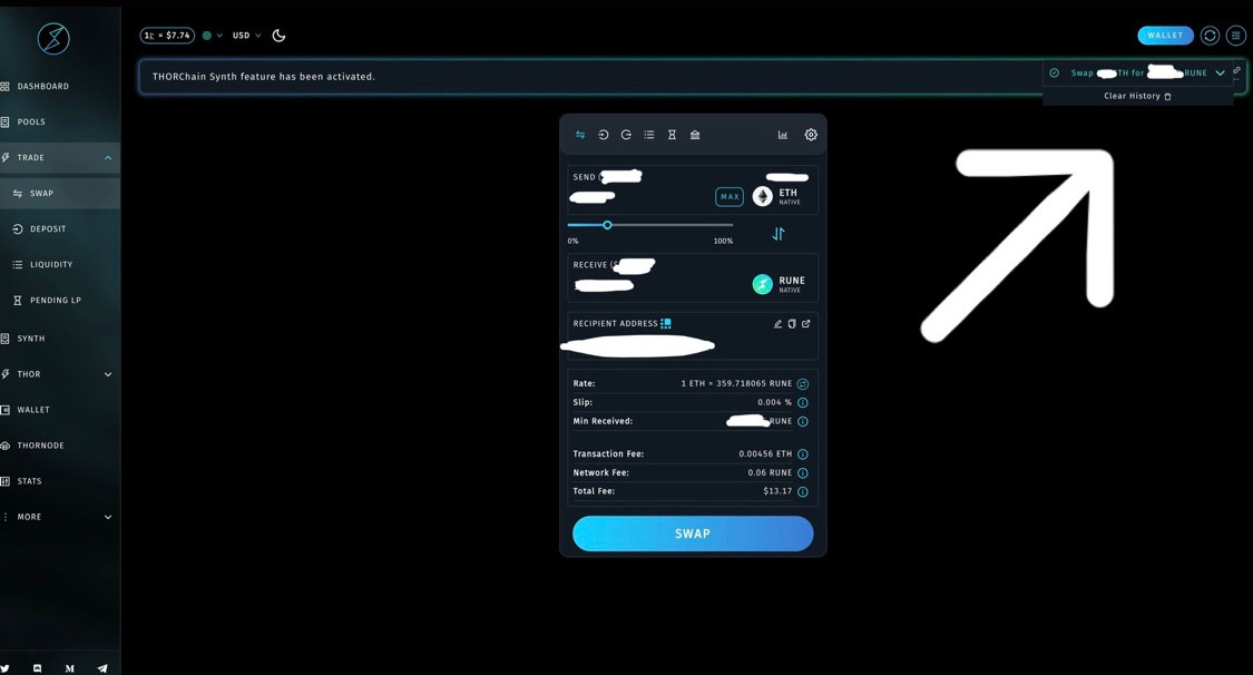 -Navigate back to our trusty sidebar on the left and click "Swap." A recipient address will now populate for your THOR wallet.