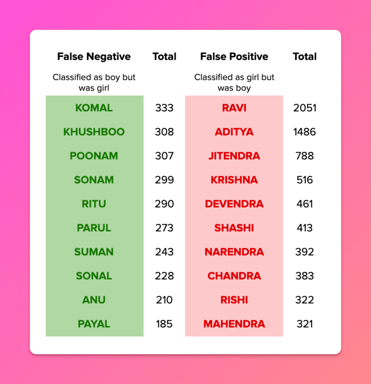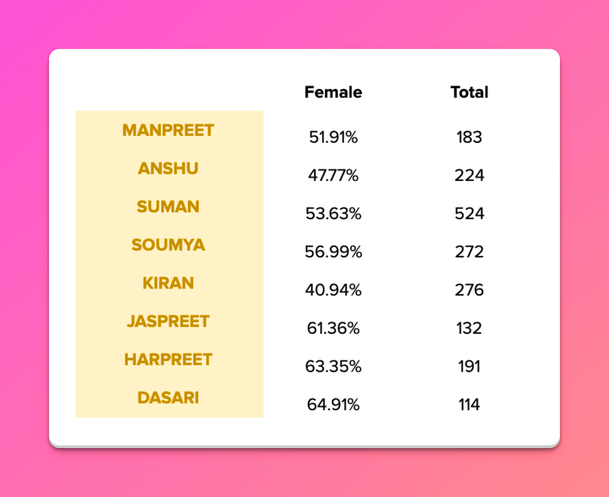 Even the perfect algorithm struggles with names that could be both boys or girls, unisex names — Manpreet, Anshu, Suman, Soumya and Kiran.