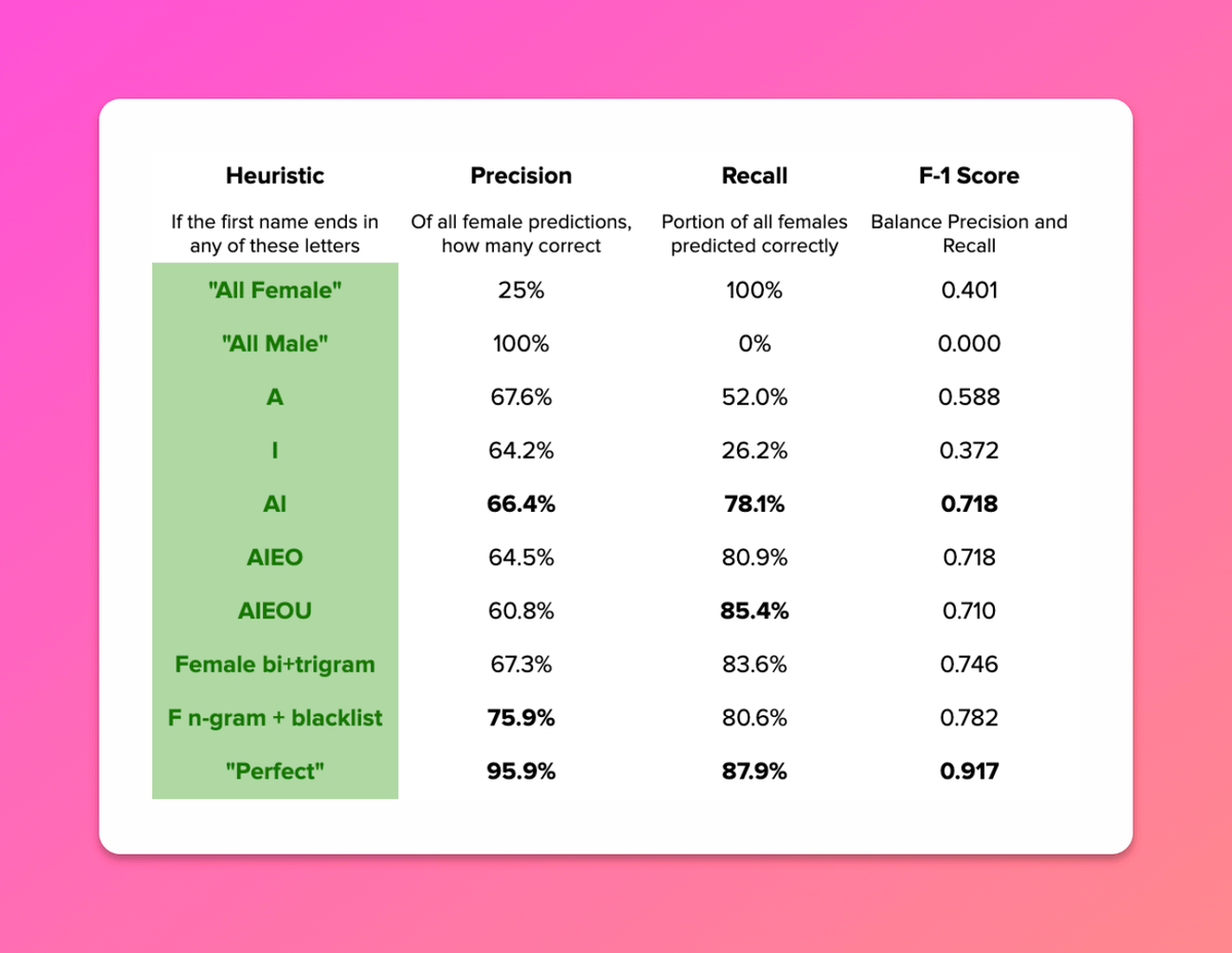 This simple heuristic works well for most common names of women / men. How well does it really do?