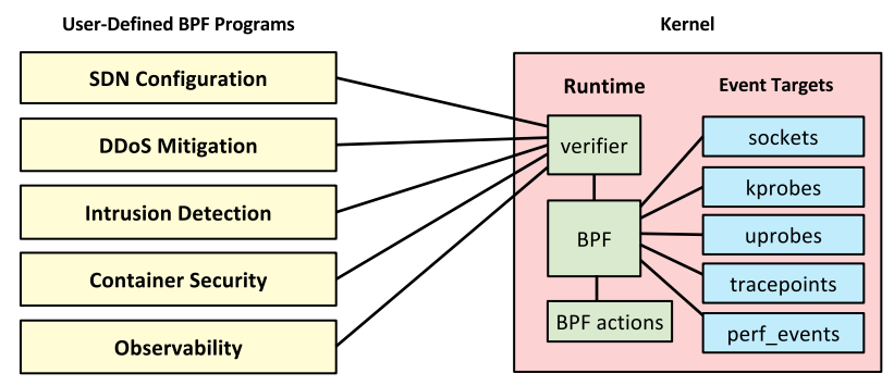 eBPF is a kernel technology (available since Linux 4.4). It lets programs run without needing to add modules or modify the kernel source code. You can think of it as a lightweight, sandboxed VM within the Linux kernel. This has implications for security!