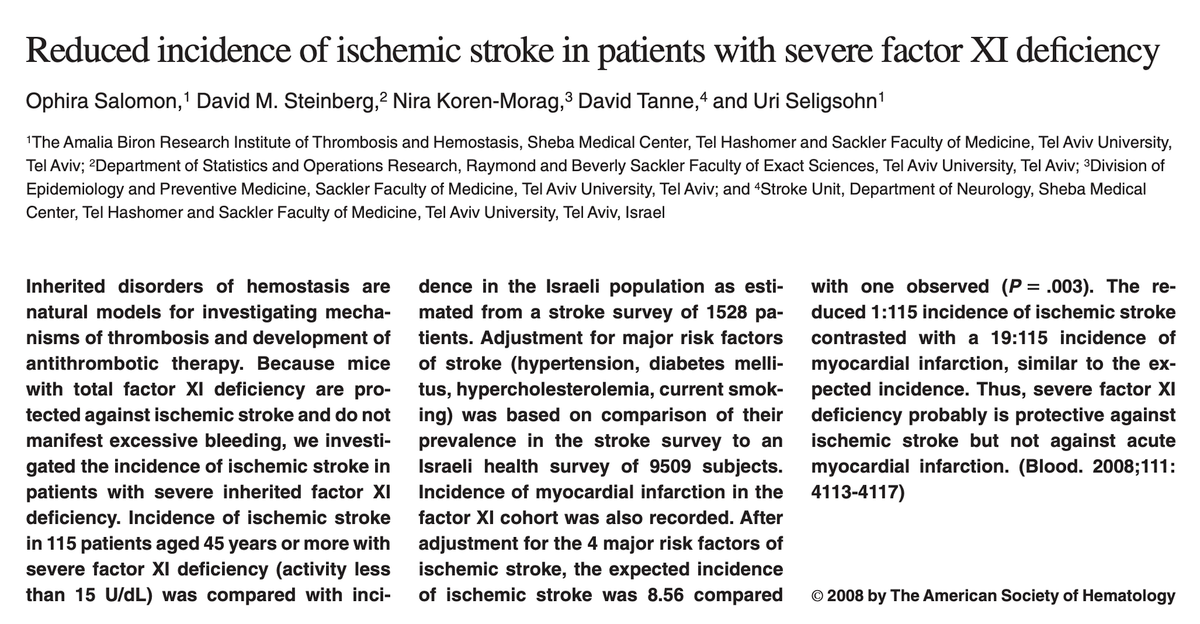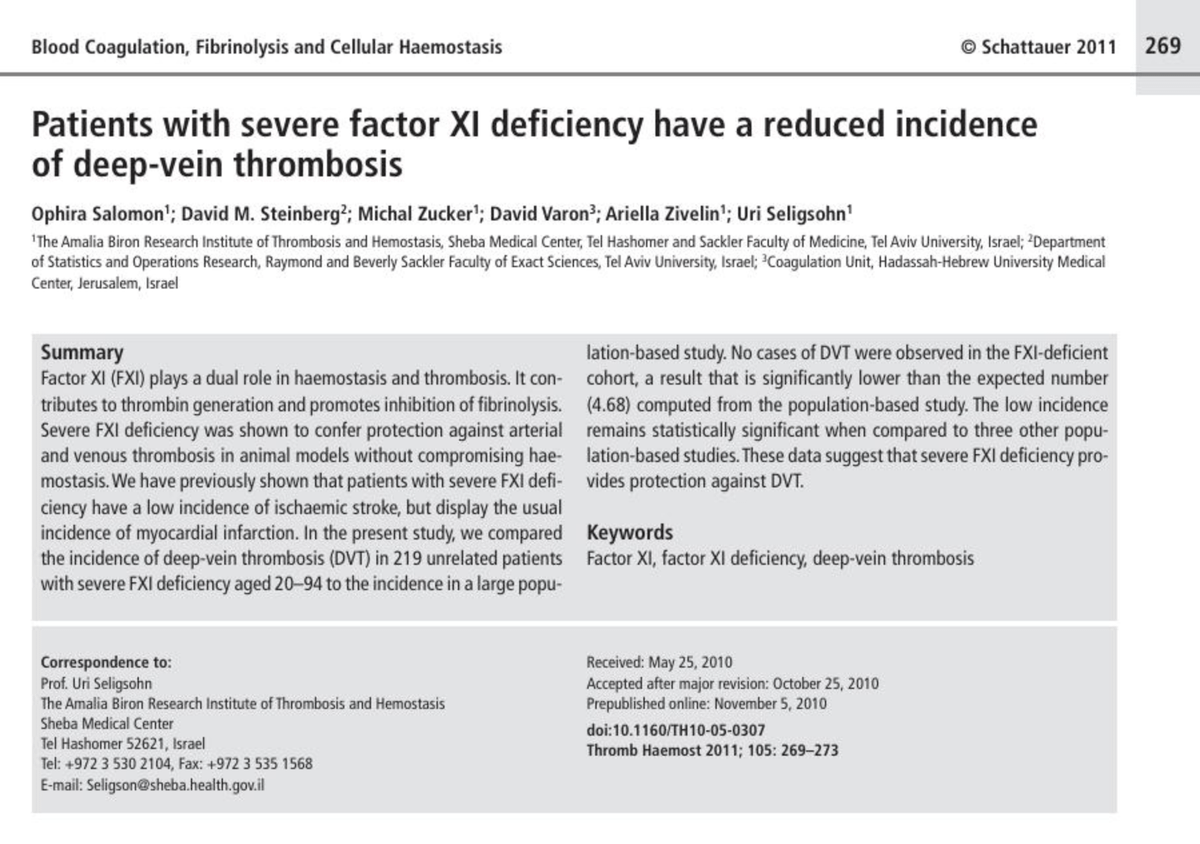 More than the bleeding tendency (which is never life threatening), the fact that attracted scientists' attention to factor XI is the association of factor XI deficiency with reduced risk for venous thromboembolism and ischemic stroke.
