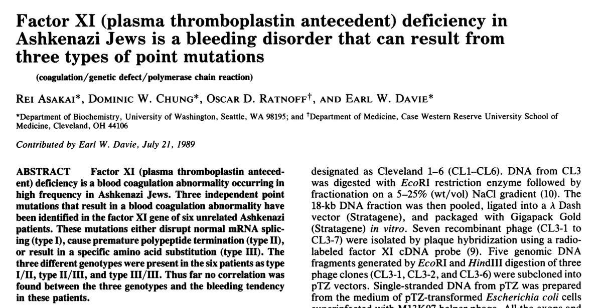 Hemophilia C is extremely common in Ashkenazi Jewish community. The prevalence is 1 in 450, compared to 1 in 10^6 worldwide. Most cases can be accounted by a handful of founder mutations that rose to high frequency due to endogamy.