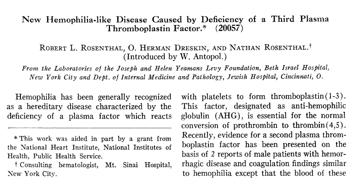 Hemophilia C has a fascinating history. The disease was first reported by Robert Rosenthal in 1953 (hence the name Rosenthal syndrome) in an American Jewish family--a maternal uncle and 2 nieces--who all had a same clinical history: abnormal bleeding after dental extraction.