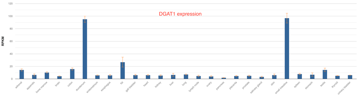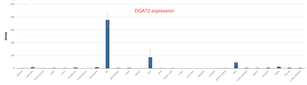 The two enzymes had interesting differences in their tissue distribution in humans. While DGAT1 is expressed predominantly in the intestine and fat tissues, DGAT2 is expressed highly in the liver, fat and skin.