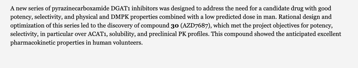 This led to the development of DGAT1 inhibitors as a potential treatment for type 2 diabetes and obesity. For e.g. in 2012, AstraZeneca (AZ) scientists published the discovery of a small molecule AZD7687, a potent and selective inhibitor of DGAT1.