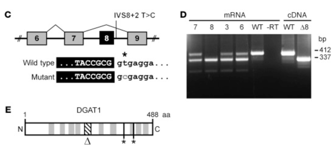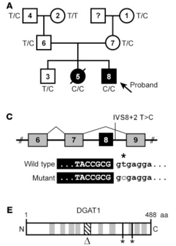 Exome sequencing of the family revealed that both the kids were homozygous for splice donor variant that skipped an entire exon resulting in complete loss of DGAT1 activity. The chances of observing this homozygous mutation in general population is 1 in 50-100 million.