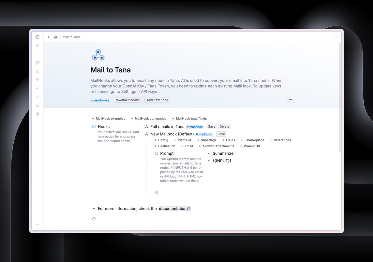 Mail to Tana runs every email you forward to it through OpenAI using your own key and allows you to customize what the AI will do with it.