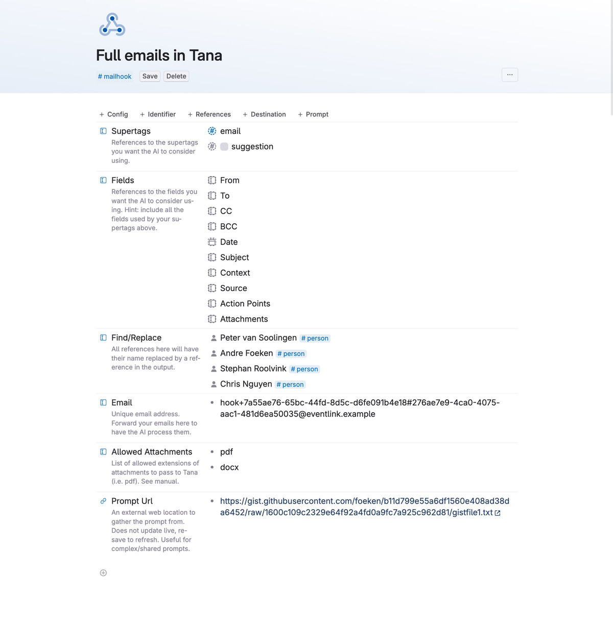 The easiest to setup is the example, which simply puts the entire email with attachments in your Tana Inbox. It also creates suggested to-do's.