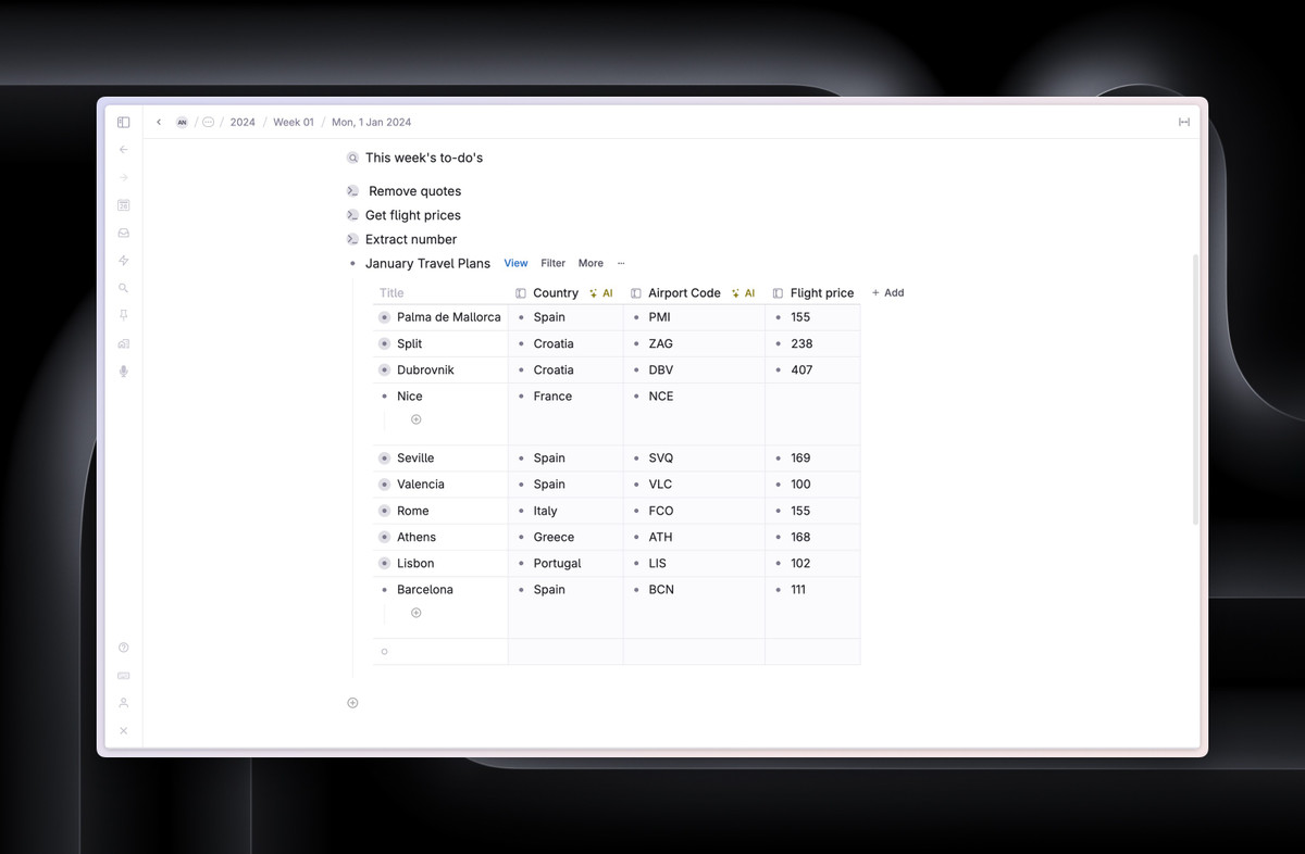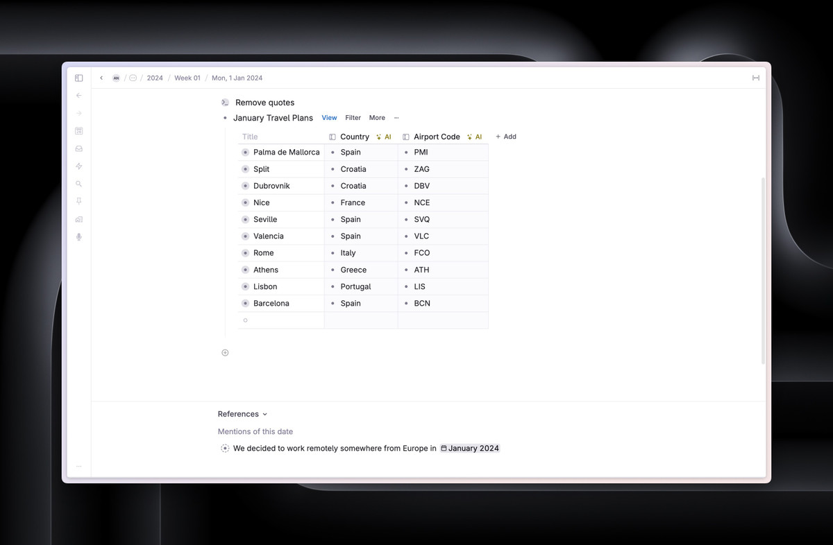 Yesterday, we started planning our January trip. We will add another field to the table, the airport code, convert it to an AI field, and remove the quotes.