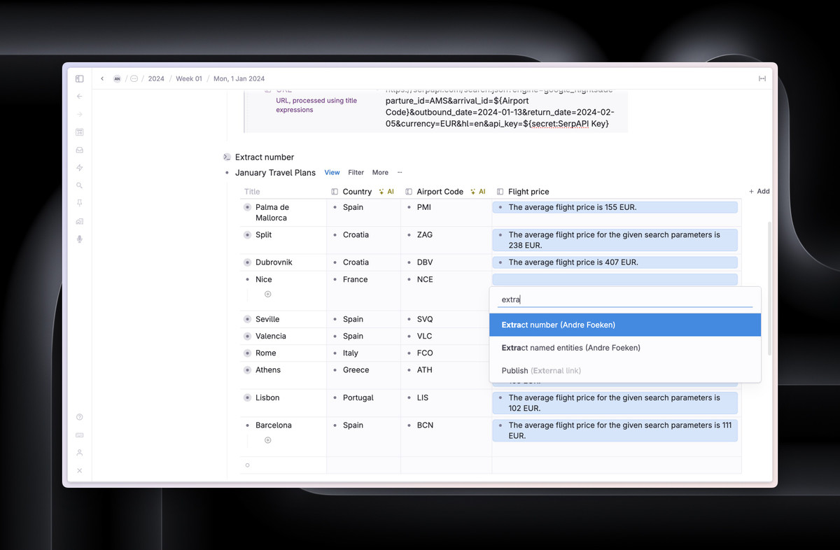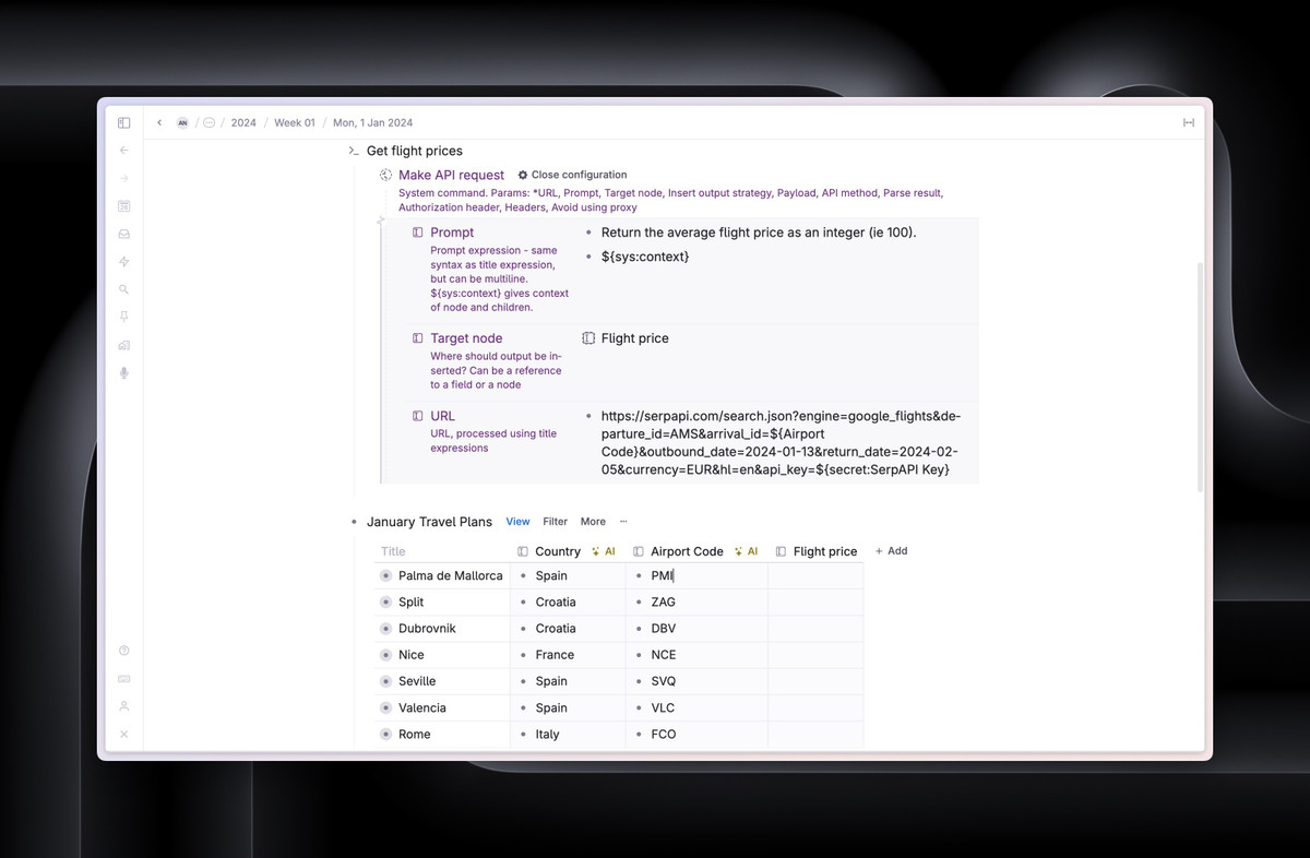 We can create a command to use the @serp_api in @tana_inc to look up flight prices. First, add a node "Get flight prices", convert it to a command node, and add a "Make API call" command.