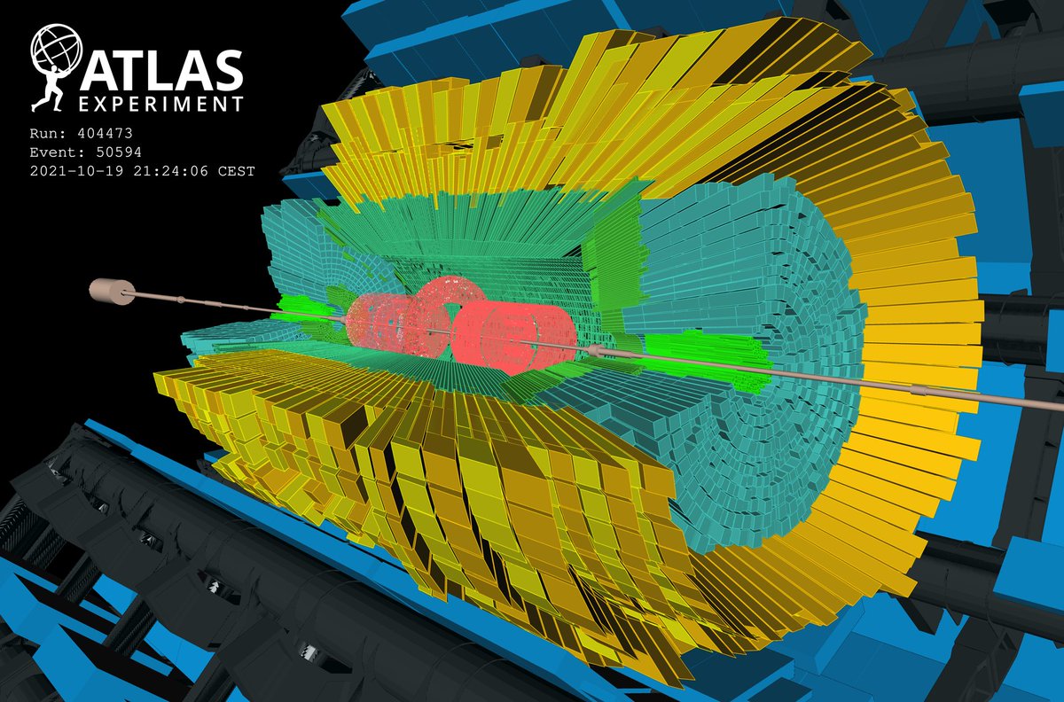 In the image, we see the energy deposited by all the particles in the inner layers of the ATLAS detector (the “calorimeters”)