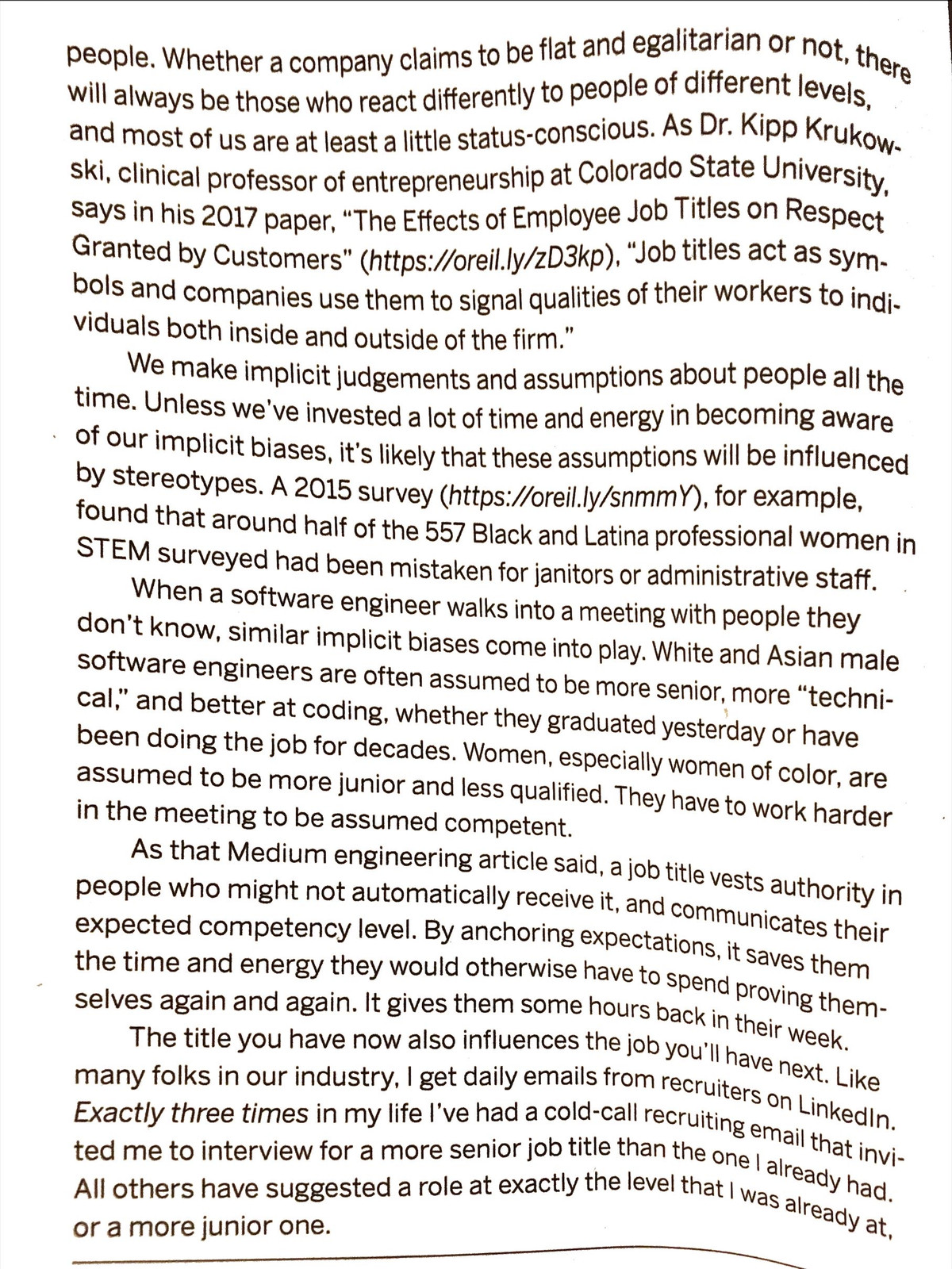 협업 시 개발자들은 서로의 실력을 가늠해야 하고, 직급이 없어진 조직에선 결국 "좋은 개발자"처럼 생긴 사람의 목소리는 (안타깝게도) 더욱 더 커진다. 성별/나이/인종이 "좋은 개발자"의 이미지에서 벗어나면 하면 오히려 내 가치를 입증시켜야 하는 피곤한 상황이 발생한다.