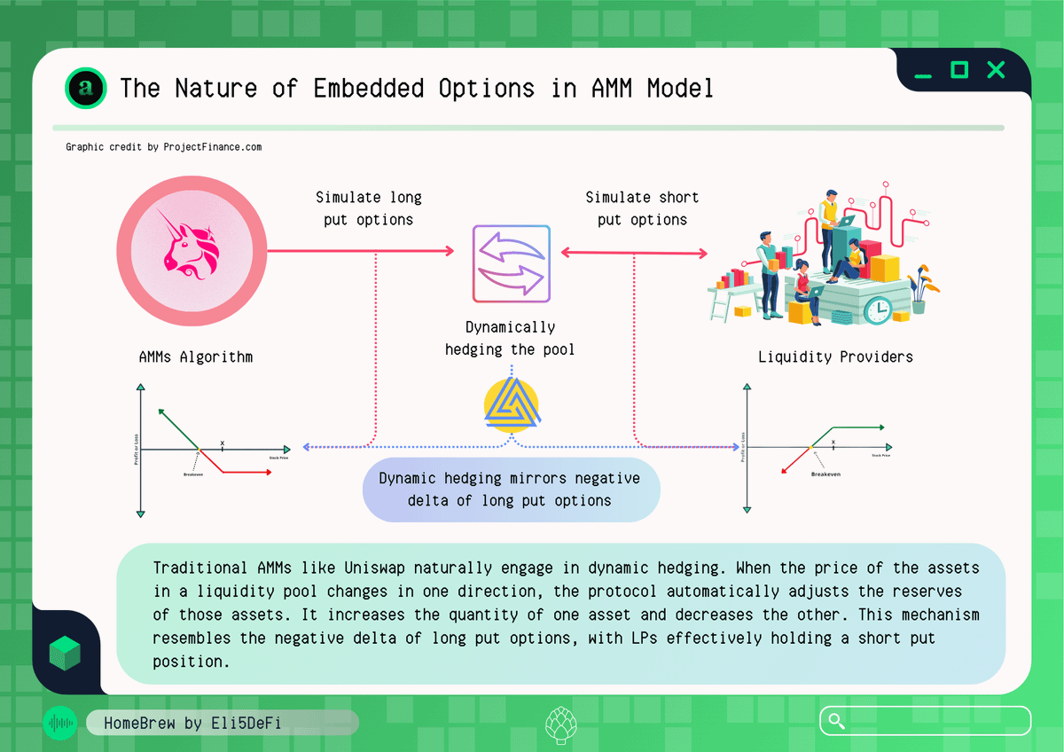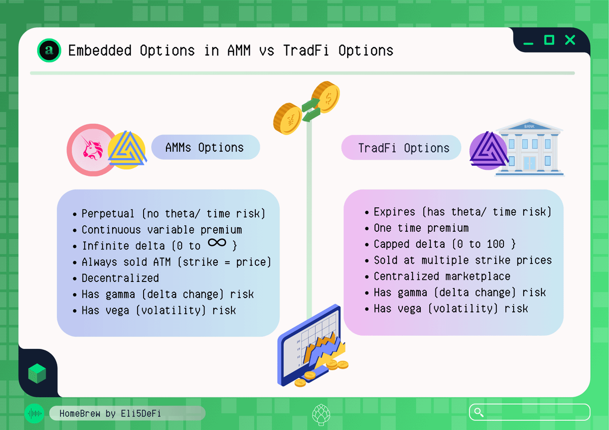 These embedded options diverge from traditional finance options because of the perpetual characteristic of the constant product formula in AMMs.