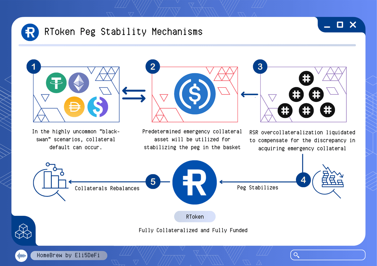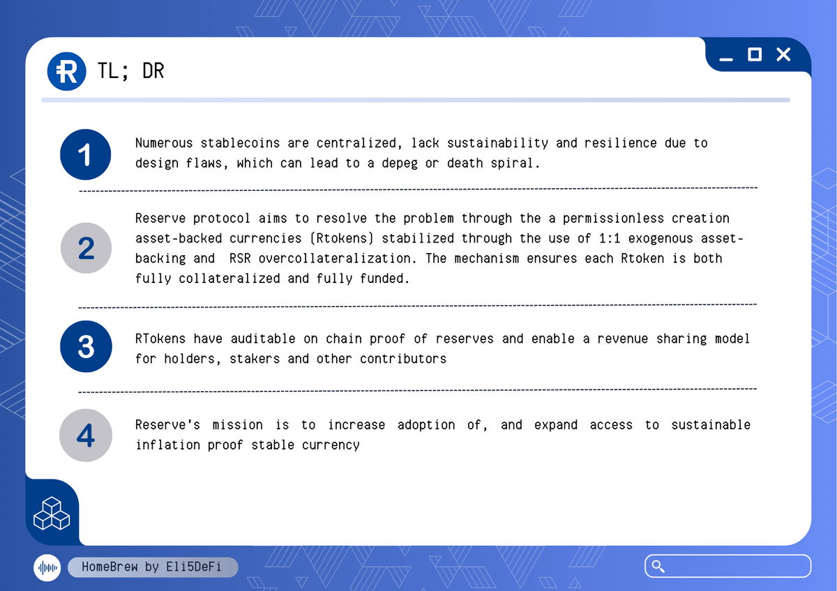 TL;DR ๐Ÿ”ต โ€ข Stablecoins often lack resilience due to design flaws, risking depegging or collapse. โ€ข @reserveprotocol aims to solve this through permissionless creation of asset-backed (Rtokens), backed 1:1 and overcollateralized with $RSR with revenue sharing features.
