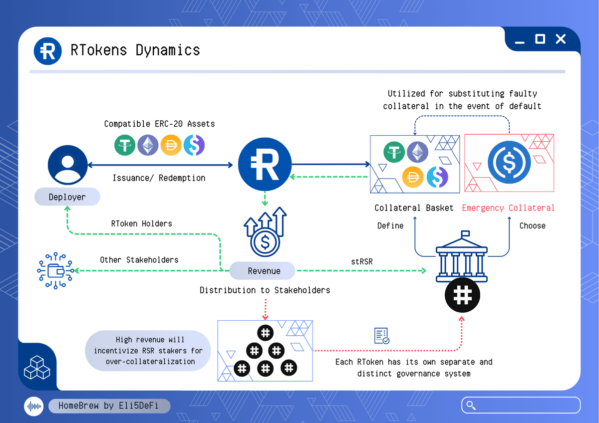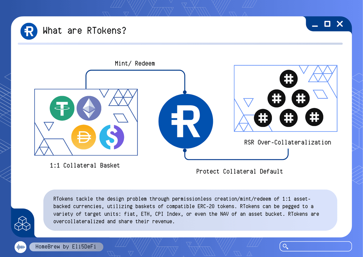 ๐Ÿ”ต RTokens @reserveprotocol address problems by enabling creation of 1:1 asset-backed currencies via compatible ERC-20 tokens called RTokens. These currencies can peg to units like fiat, ETH, CPI Index, or asset bucket NAV. RTokens overcollateralize and share revenue.