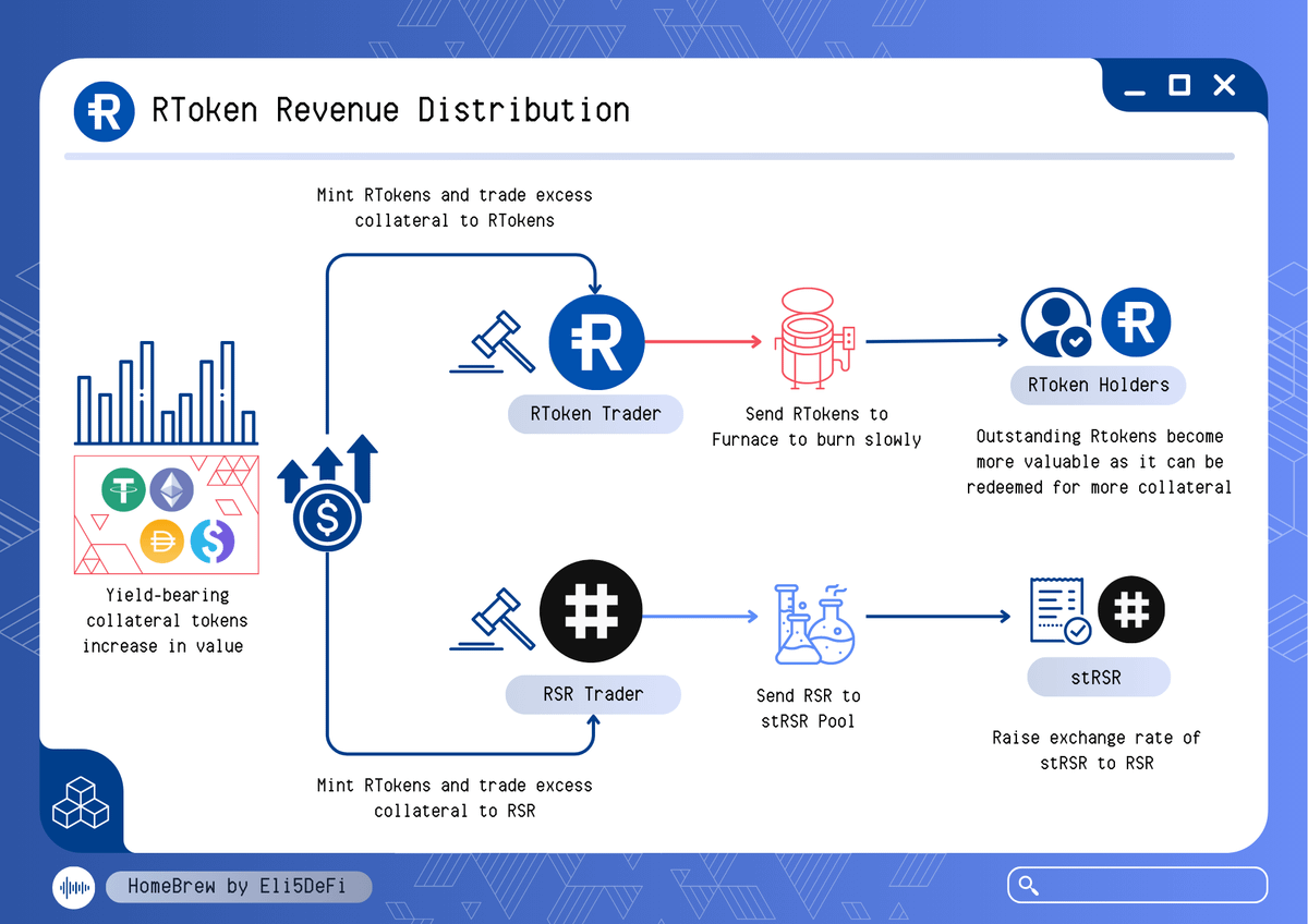 ๐Ÿ”ต Sharing Revenue Revenue generated by Rtokens is distributed to both RToken holders and RSR stakers. This is accomplished through minting and trading surplus collateral, enhancing the value of both RSR and Rtoken.