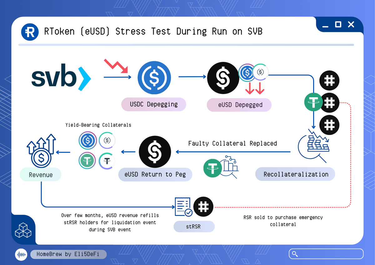๐Ÿ”ต RToken Resilience Amid the SVB run, one result was $USDC's depegging. This systemic impact decreased the value of several $USDC derivatives, including one used as eUSD collateral. However, recollateralization mechanism stepped in, returning eUSD to its peg.