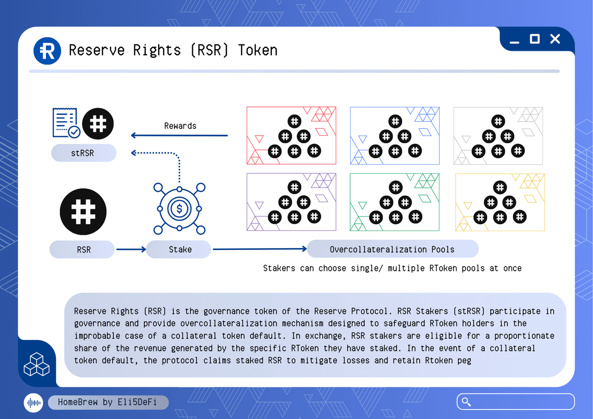 ๐Ÿ”ต RSR Tokens Reserve Rights (RSR) is the governance token of @reserveprotocol and also functions to safeguard RToken's peg. RSR Stakers (stRSR) participate in governance and provide overcollateralization to protect RToken holders in the event of a collateral token default.