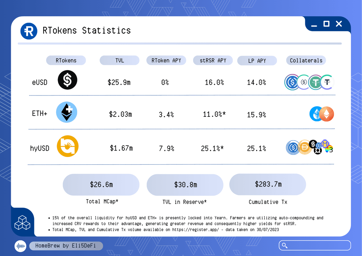 ๐Ÿ”ต Statistics The three primary Rtokens, eUSD, ETH+, and hyUSD, also exhibit substantial TVL along with respectable APY through revenue sharing. The significant revenue originates from yield-bearing assets utilized as collateral and strategic rewards compounded techniques.
